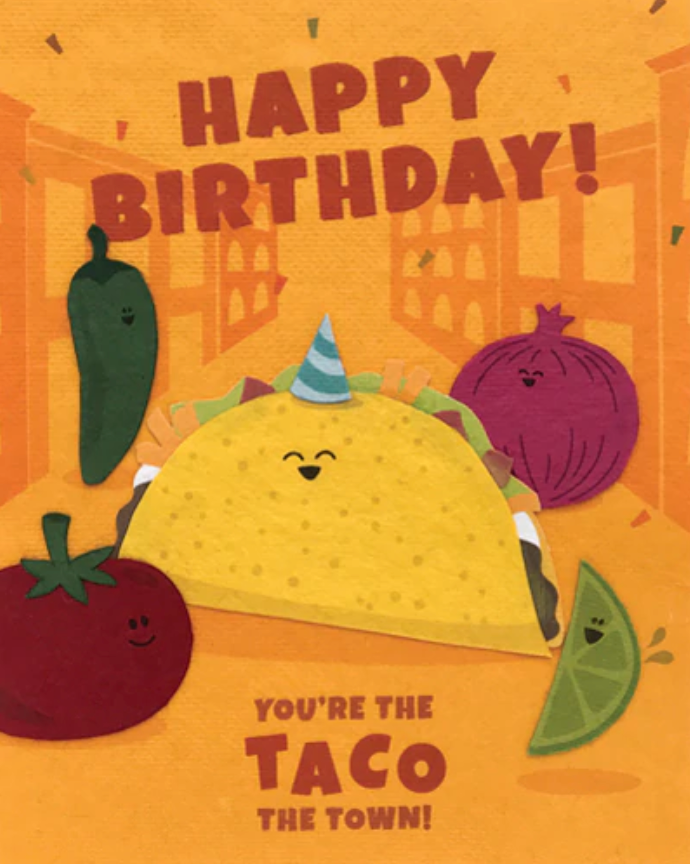 Our "Taco The Town Birthday” card is lovingly handcrafted in the Philippines by women survivors of sex trafficking. The card incorporates a variety of handmade, recycled papers, making it environmentally sustainable, too. Envelope included.