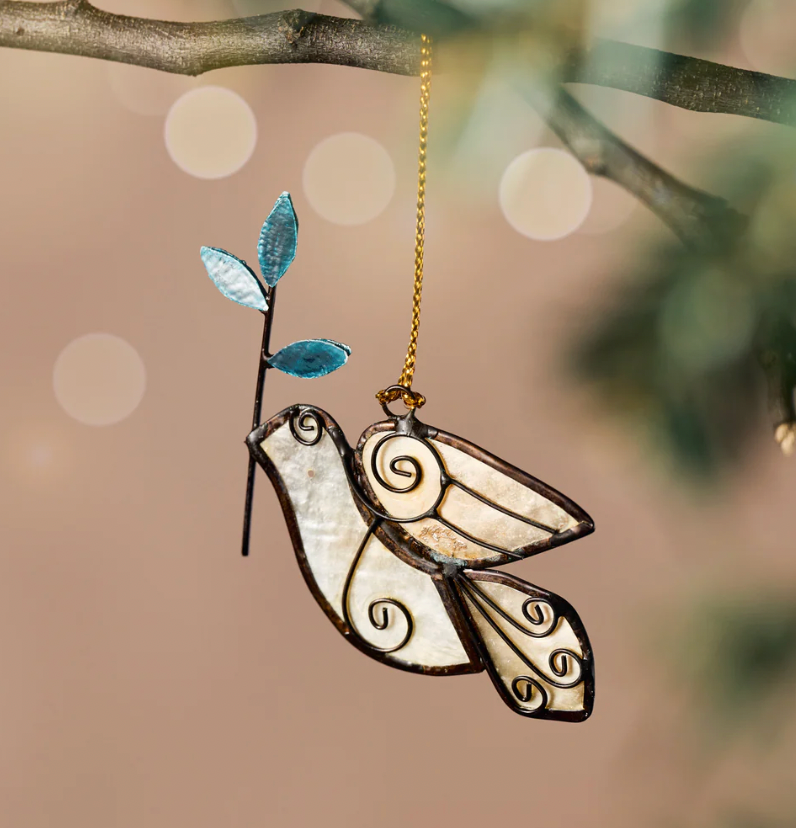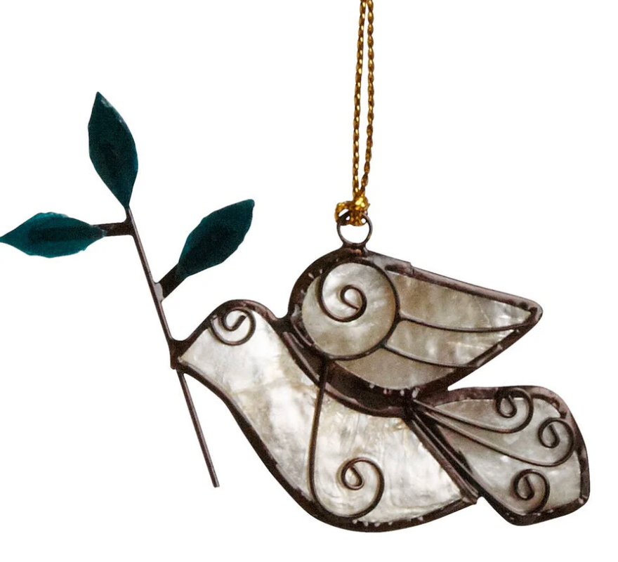 Peace on Earth-a holiday message everyone shares. Dove with olive branch is handcrafted in translucent capiz. Capiz is the thin shell of a marine mollusk. First artisans wash and soak shells. After the shells have dried, they are cut into shapes and edged with metal wire. A finishing coat of varnish completes this labor-intensive process. Before glass windows became available in the Philippines, capiz was used for windows in houses. Decorative only. Keep out of reach of children.