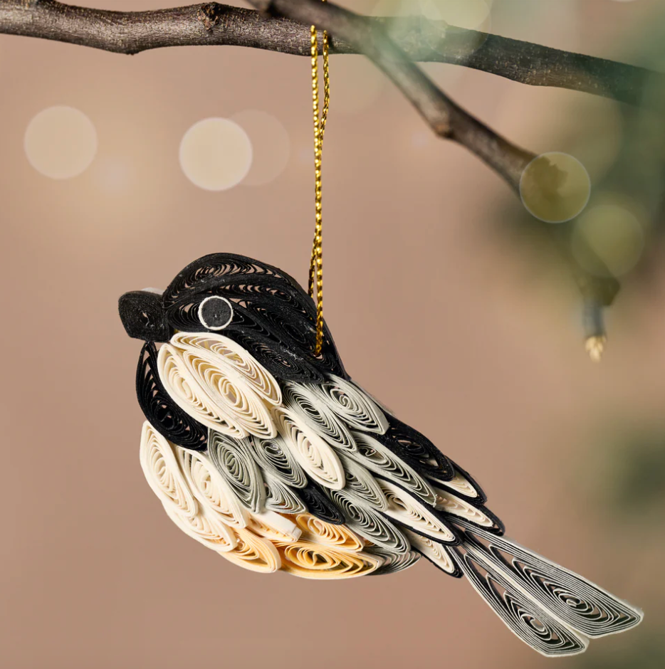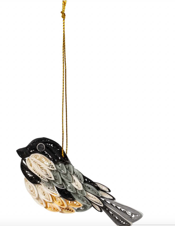 A Christmas chickadee for your Christmas tree-a unique ornament with creative 3D feathers made from quilled recycled paper. Handcrafted in Vietnam by fair trade artisans, this Christmas ornament hangs from a metallic gold thread.