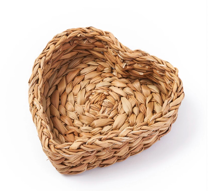 This delightful heart shaped basket is handcrafted from hogla leaves by master artisans in Bangladesh. Due to their perpetual and abundant grown, it is said that hogla leaves are one of the most sustainable materials that nature provides for us. The plants are harvested and dried into strips or fibers that are hand braided and woven into a variety of products. Age old basket weaving techniques are applied to achieve this endearing heart shape. On its own, this hand woven storage basket is both beautiful and functional. An attractive addition to an entryway for mail and keys, or on a desk or dresser for jewelry, stationary, spare change, rare coins, or precious stones. With its well-defined heart shape, this basket lends itself nicely for holidays, gift giving, and unique gift basket ideas. Collect smaller items and gift within this lovely heart basket. Once the items are used up or relocated, the basket will serve the recipient as a functional keepsake. This would be ideal for a Valentine's day gift or a Mother's day gift. Collect pamper items for a new mom, new dad, mom to be, an elderly loved one, or a friends who simply needs to treat themselves. Deliver as a self care basket, spa at home gifts basket, pamper yourself gift basket, or DIY spa basket. Create a get well basket or a sympathy gift basket. Year round this natural fiber basket will make a great tabletop fruit basket or baked goods basket. Explore our website for jewelry, candles, soaps, and home decor to create an out of this world ethical gifts basket!