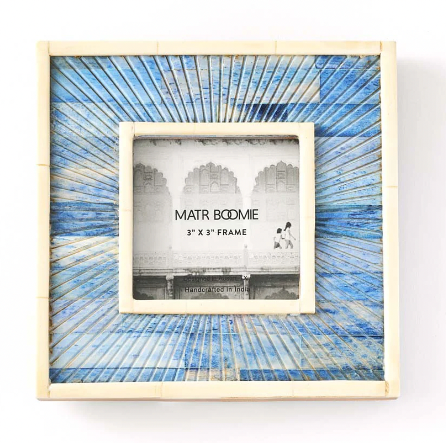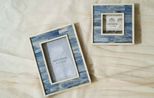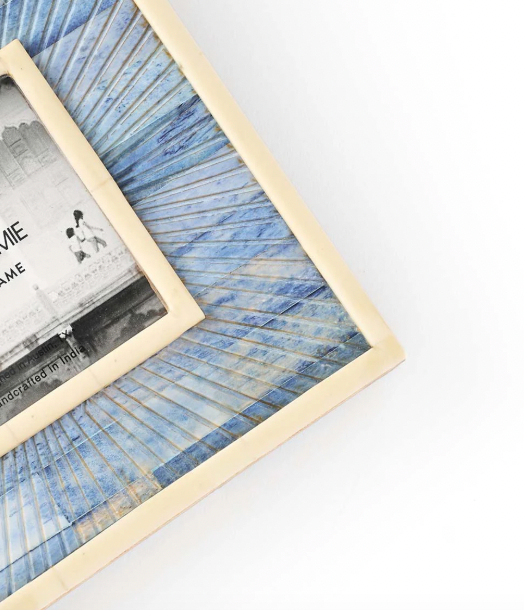 Capture and display your favorite moments with the Neela 4x6 Picture Frame, made from ethically sourced bone and dyed in beautiful coastal blue tones. Each frame features unique variations, adding a touch of elegance and serenity to your decor while celebrating the beauty of the sea. Its versatile design allows it to be showcased on a tabletop or hung on a wall as part of a gallery display. Each fr