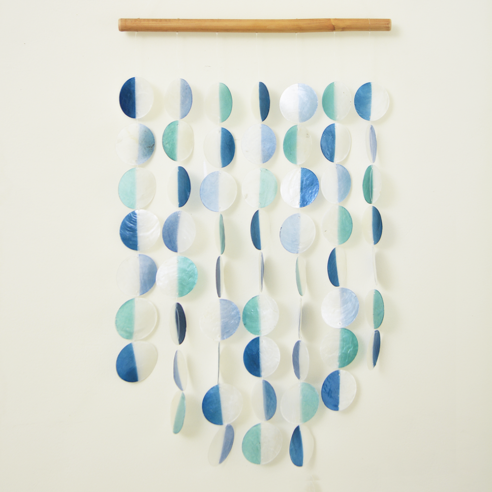 Our capiz chimes are made up of a stunning array of shapes and colors. They sparkle in the light, and when placed outside, create a gentle tinkling of the shells. Our capiz supply comes from a fishing village in Java, where our shell artisans sustainably harvest the shells and shape them. All parts of the capiz (jingle oyster) are used; the meat is used for food, the main part of the shell for handicraft, and the shell waste for fertilizer. Only full-grown shells are picked from the kelp beds, where they grow, which provides more space and food source for the young ones to grow. All our Capiz chimes are made with care in our fair trade, in-house workshop in Bali.