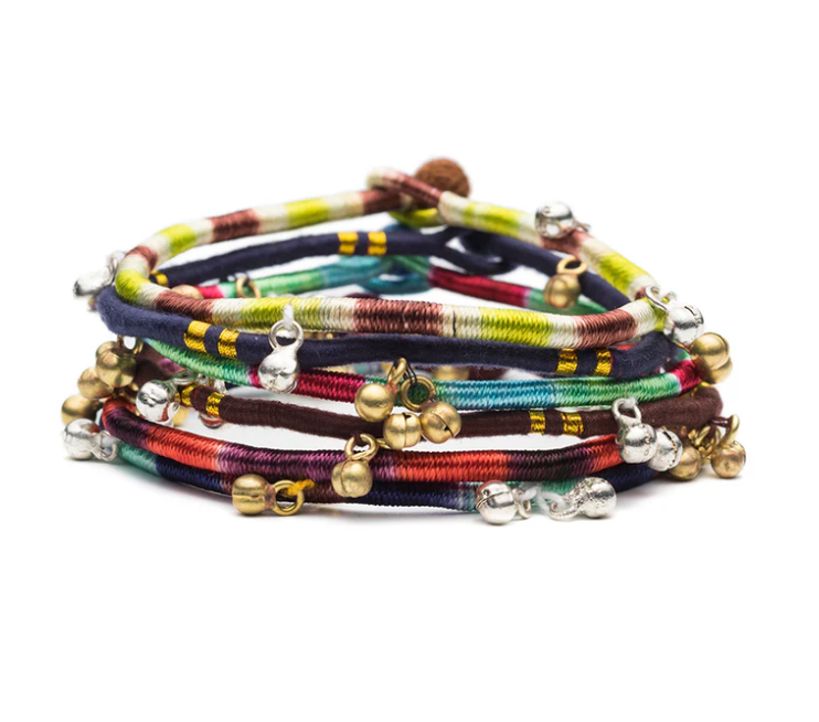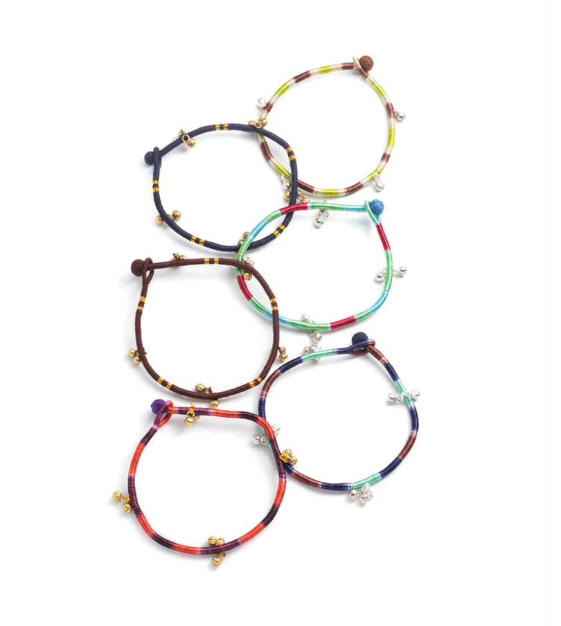 Your feet will sing in these anklets! Chum chums are traditional Indian anklets worn to make a delicate "chum" as you wear them. The perfect accessory for a day at the park, music festival, beach, and more! Cotton wrapped anklet in striped colors with tiny dangling bells. Color combinations for anklets with gold bells: navy and gold, red and purple, and brown and gold. Color combinations for anklets with silver bells: green and brown and white, navy and brown and mint, and red and green and light blue. Loop and ball closure. Colors will vary. Sold Individually.