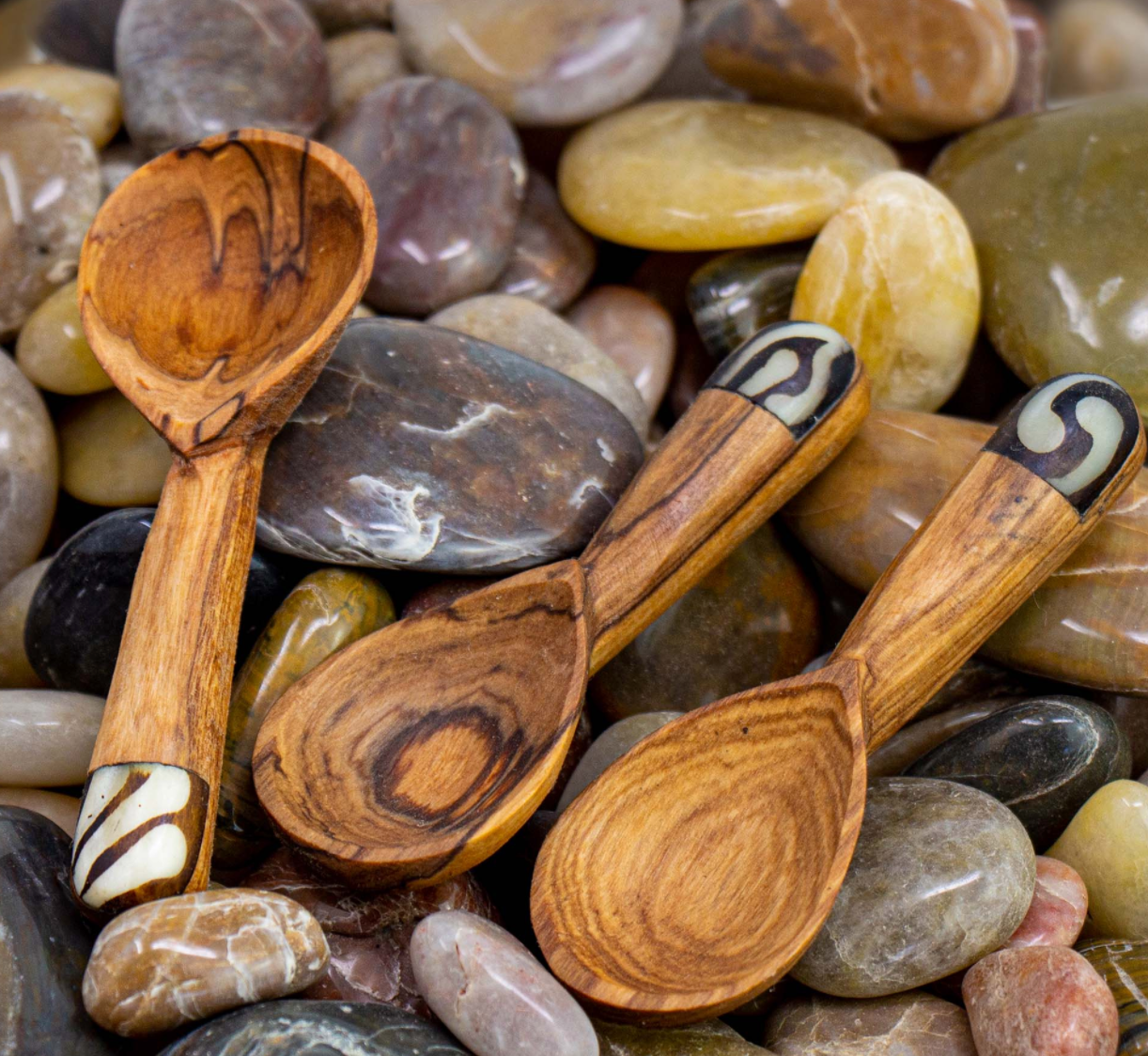 Artfully carved from a single piece of olive wood using simple hand tools by Kenyan artisans. The craftsmanship showcases the beautiful natural wood-grain and is accented with batiked bone inlay. No two are alike; variations are to be appreciated and enjoyed by the consumer. These petite scoops are great for serving nuts, appetizer, candies and more. Product Features: Measures Approximately 3.5-4 inches long; bowl is around 1.25 inches diameter. Sizes will vary slightly due to the hand-carved nature of each piece. Hand wash and air dry. Socially responsible goods that is empowering to consumers to purchase according to their values and help alleviate poverty. Fair trade is so much more than a product assortment. It's about safe workplaces, fair wages + community investment. Made from sustainably sourced wood. Story Behind the Art: Each piece of olive wood is carved using rudimentary tools, giving the bowl unique marks left by the hand of the artisan. The bone accent is crafted using the batik process which is an age old art used in Africa. The patterns are applied by placing wax on the white bone and dipping the bone into a dark brown/black dye, resulting in the beautiful African mud cloth designs. Note: Because these are made by hand using rudimentary hand tools, no two are identical and variations are to be appreciated and enjoyed by the consumer. Sizes will vary from piece to piece. Batik designs will vary. Each is a piece of art. Sold Individually.