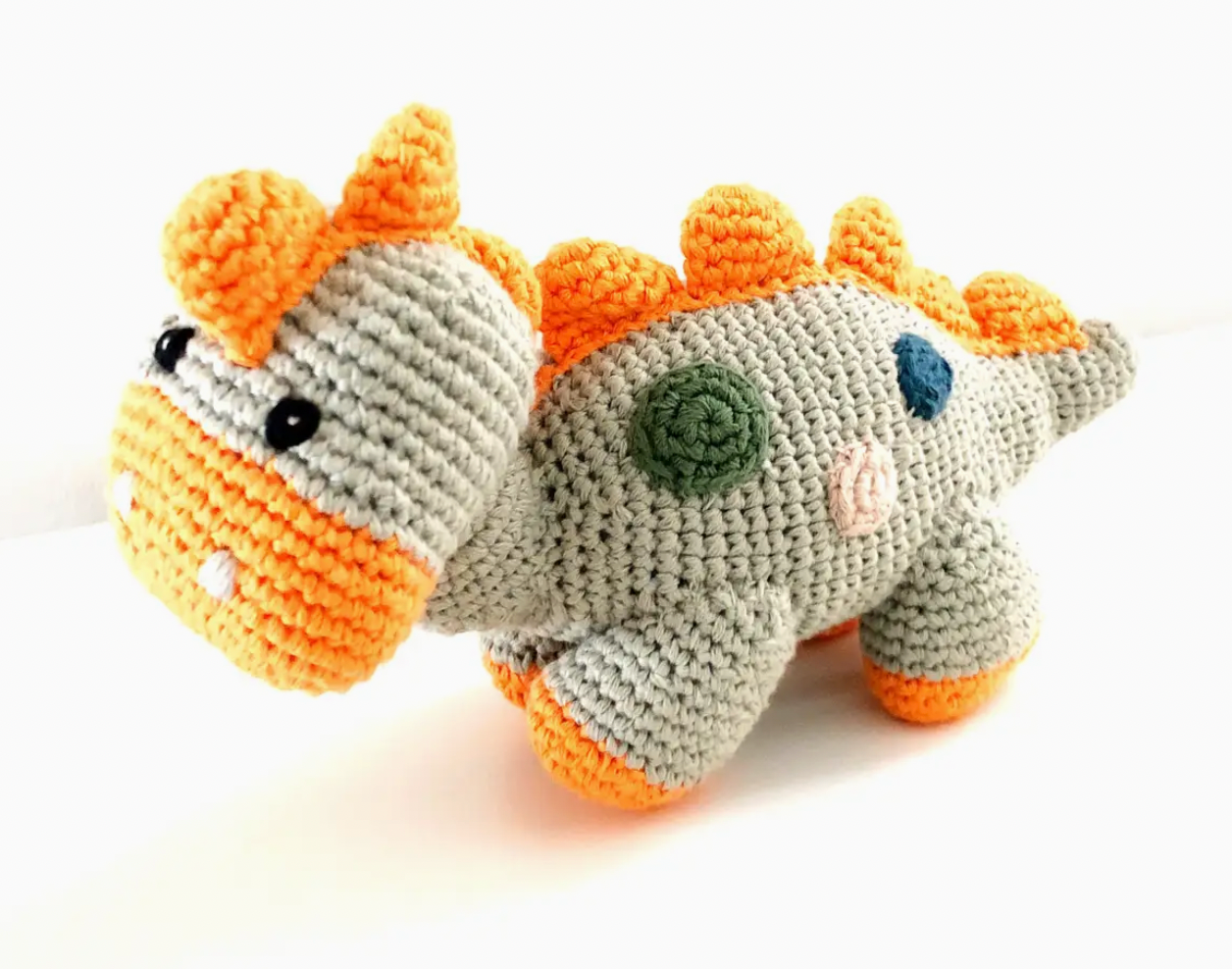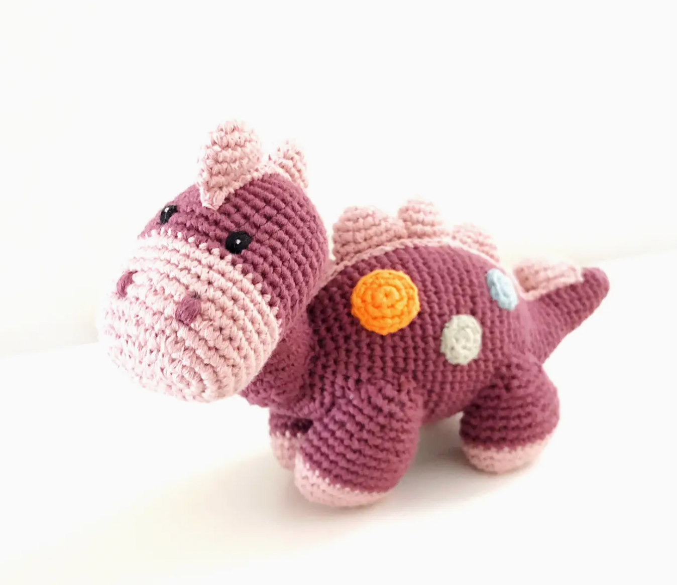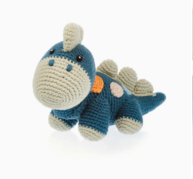 Let their imagination wander back to prehistoric times with this darling plush stegosaurus kids toy. Handmade with soft organic cotton yarn, this timeless stuffed animal makes a delightful gift for a baby shower or baby's first birthday. The rattle inside gives a very soft sound when shaken. Fair Trade. Artisan Made. Durable & Washable. Always a top seller.