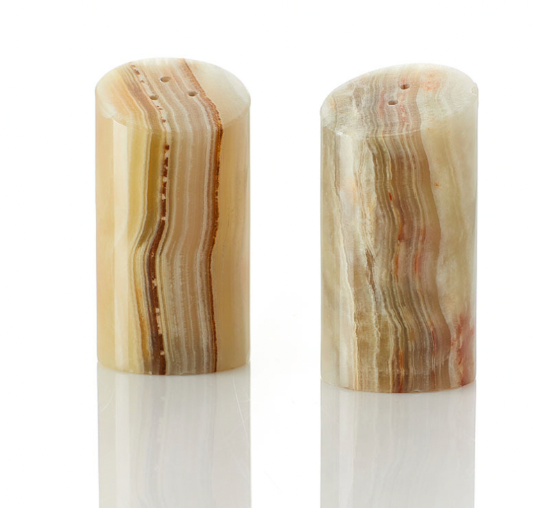 Artisans in Pakistan select the highest quality pieces of white onyx to carve into high-quality salt and pepper shakers, each with its own natural patterns and variations. Timeless pieces are perfect for home use, or as housewarming or wedding gifts! Each shaker comes with plastic screw cap in base. Colors will vary, let us choose for you. Dimensions: 3"h x 1 1/2"dia