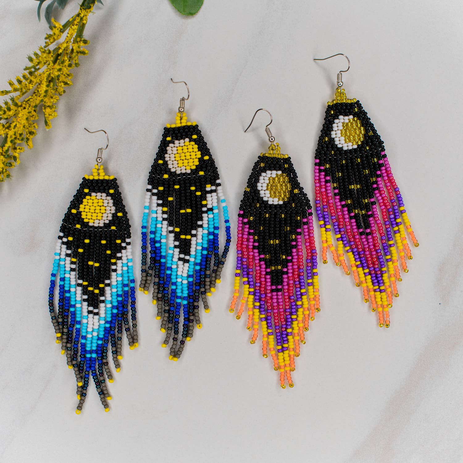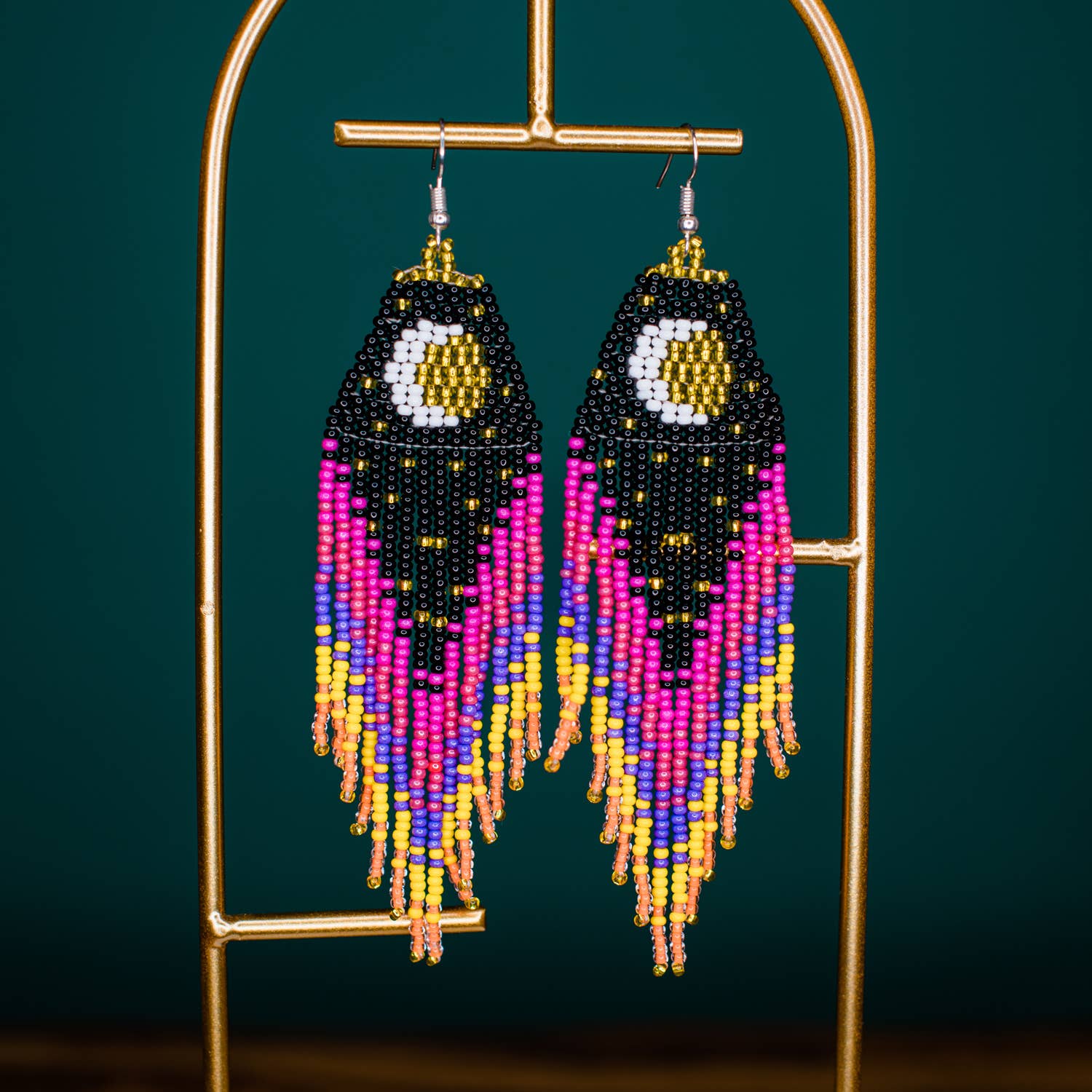 The crescent moon illuminates the sky with a mystical element that can inspire creativity. Wear the Crescent Moon Fringe Earrings as a statement piece and let your creativity flow! Measures 4 3/4" L with nickel free earwire X 1 1/8"W Each earring comes in assorted celestial colors hand beaded by Artisans in Guatemala! Colors will vary, please inquire about current selection.