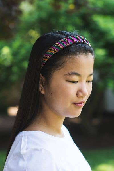 The fair trade Toto Headband is wrapped in a fun striped Guatemalan fabric with a diamond pattern in a solid color on top. The wrapping, in addition to having a gorgeous effect, also makes these headbands super comfortable to wear! Each purchase empowers Guatemalan artisans.