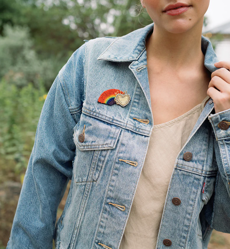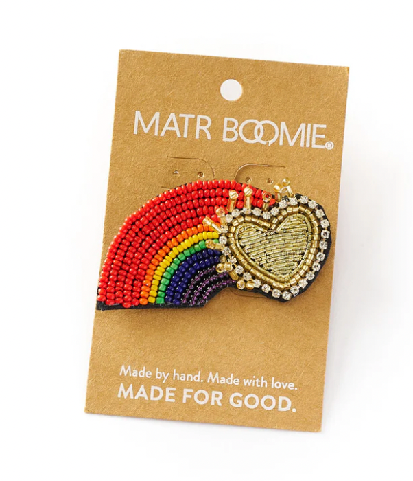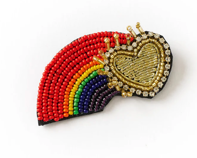 The Bala Mani Beaded Rainbow Brooch Pin is handcrafted by artisan makers in India, who use colorful beads, thread, and sequins to create cute motif brooches. Wear or gift a single pin of a favorite motif or together with other pins to show off a unique sense of style! This bright rainbow with a beaded heart is sure to brighten up someone's day. Dimensions: 1.25"L, 2.5"W Materials: fabric and beads Care Instructions: Spot clean.