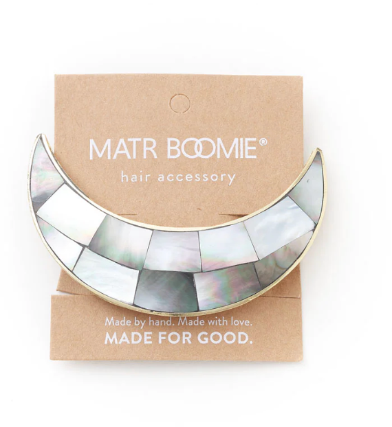 Add a touch of mystique or drama to any outfit or occasion with this crescent moon hair clip inlaid with black lip mother of pearl shell. Exclusively designed in Austin, TX and handmade with love by artisan makers in India, discarded oyster shells are collected and pieced together to create one-of-a-kind, fair trade jewelry and accessory pieces. Wear alone or pair with other items from our Chandra Collection