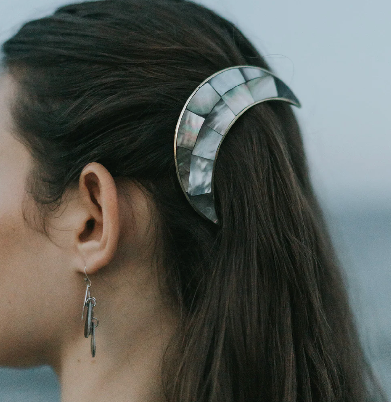 Add a touch of mystique or drama to any outfit or occasion with this crescent moon hair clip inlaid with black lip mother of pearl shell. Exclusively designed in Austin, TX...