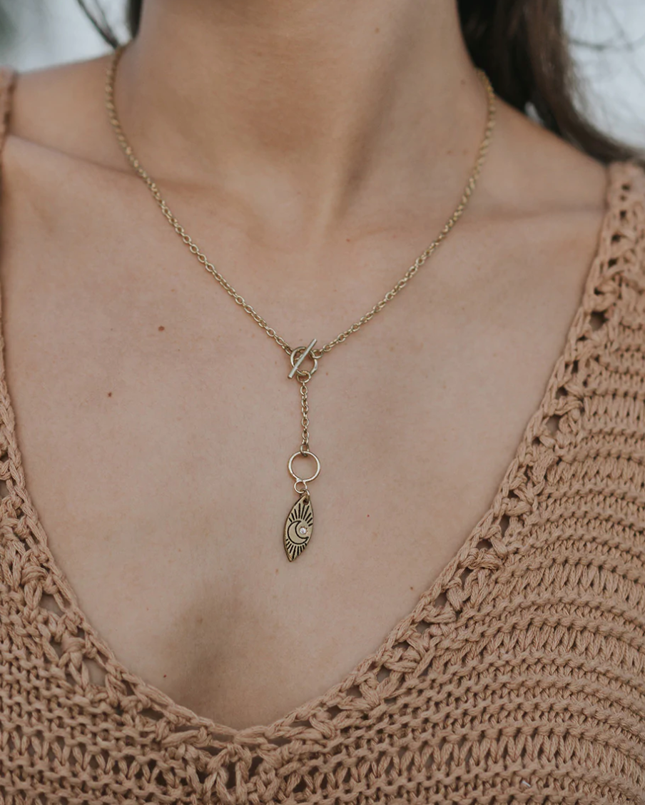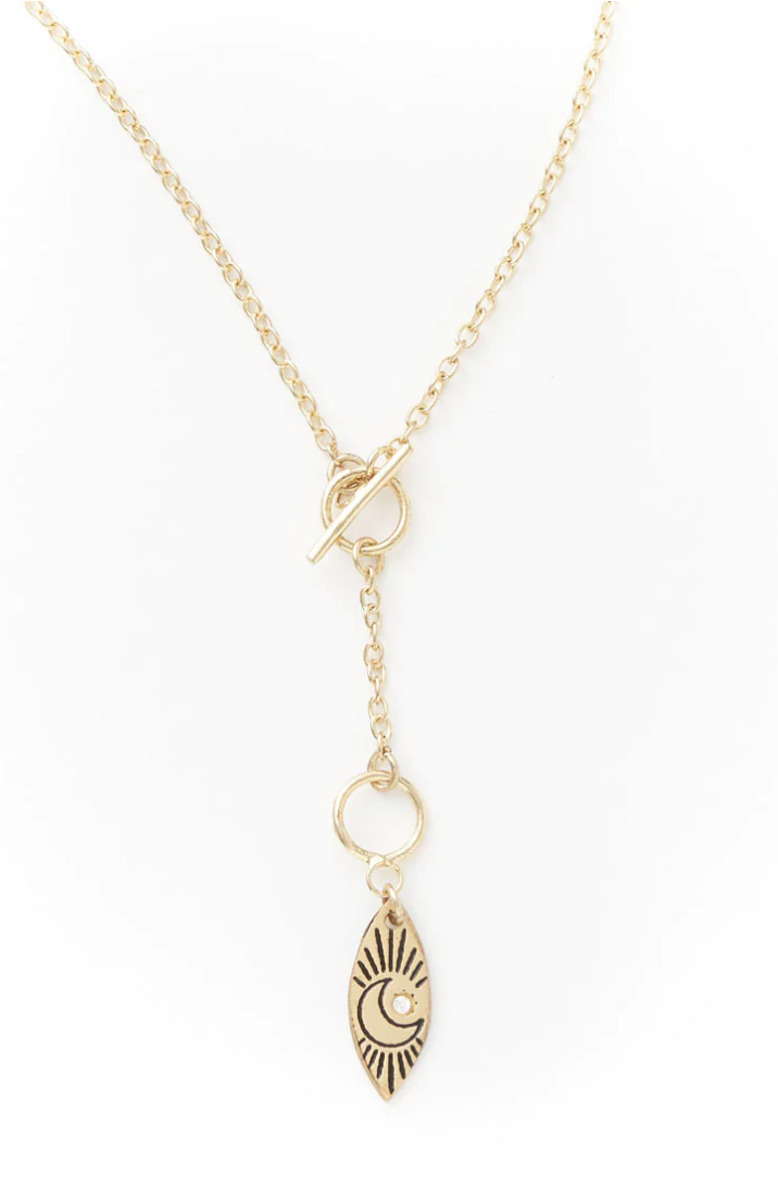 This 3-in-1 gold finish charm lariat necklace can be worn at two different lengths, or with the charm to the back. Ruchi the name of Matr Boomie founder Manish's wife, co-founder and designer, is an Indian name meaning light or beauty. This timeless style features a lotus carved on the pendant, is inlaid with a 1.5mm cubic zirconia.