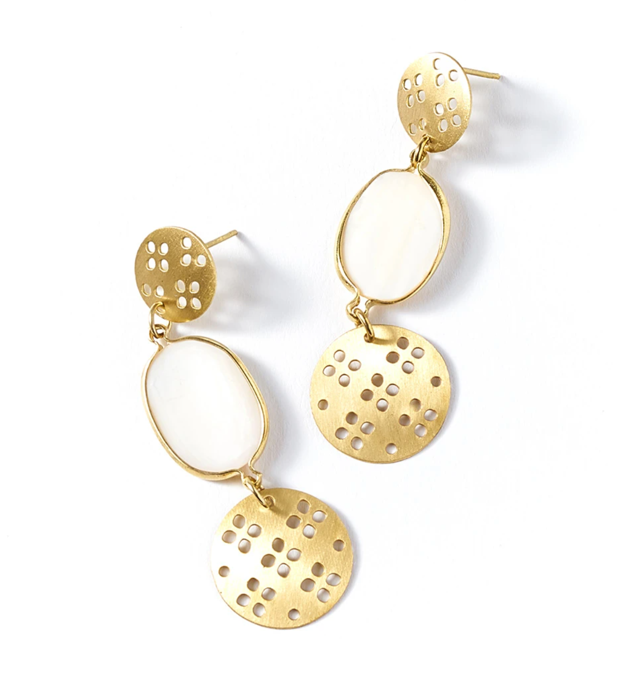 Our enchanting Dhavala Collection features brilliant mother of pearl and expertly handcrafted gold finish settings. Traditional jewelry making techniques of Old Delhi are thoughtfully applied in this modern design. These handcrafted, long post earrings feature mother of pearl charms and gold finish filigree coin charms.