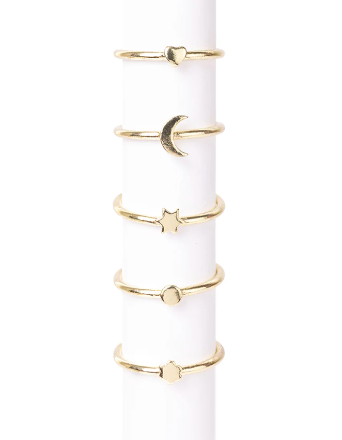 The Dhera Assorted Charm Stacking Rings set includes an assortment of 24 charm-accented rings in sizes 6–9. With motifs such as hearts, stars, moons, flowers, and dots, this set offers broad...