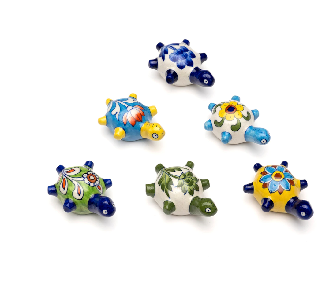 Jalini Desk Mates feature the master craftsmanship of Blue Pottery of Jaipur with intricately hand painted detail and lead-free glaze. Pottery is an age-old art in India. Artisans in Rajasthan use a potters wheel, handmade molds, and their hands to shape natural clay into beautiful works of functional art with a polished finish. This Jalini Desk Mate features a well loved turtle design and hand painted detail inspired by regional flora and fauna. Sold individually.
