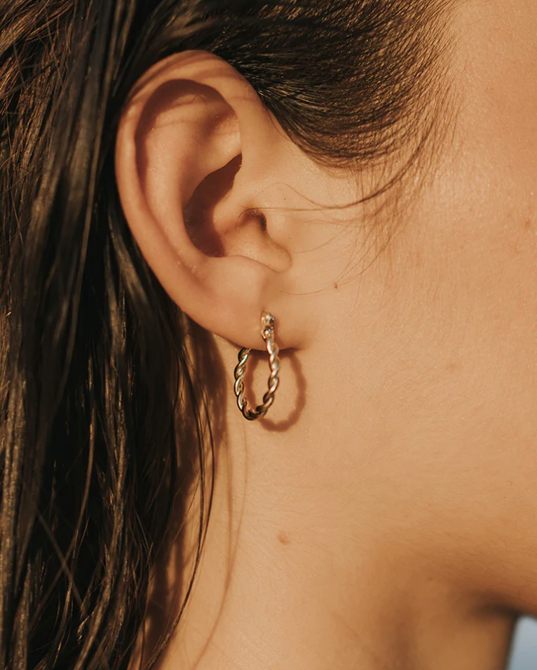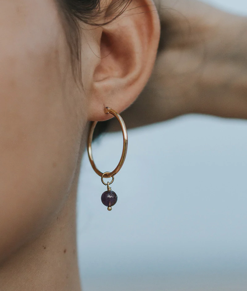 This ethically handcrafted set of 2 dainty, gold finish hoop earrings feature timeless designs. This duo, featuring a simple braided hoop and amethyst bead drop can be worn alone or together to showcase an effortless, minimalist look.