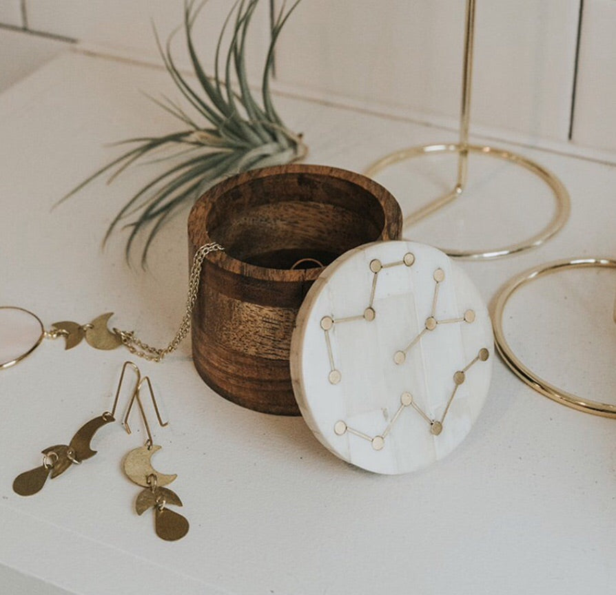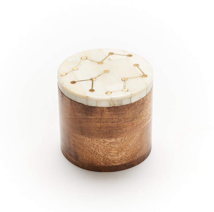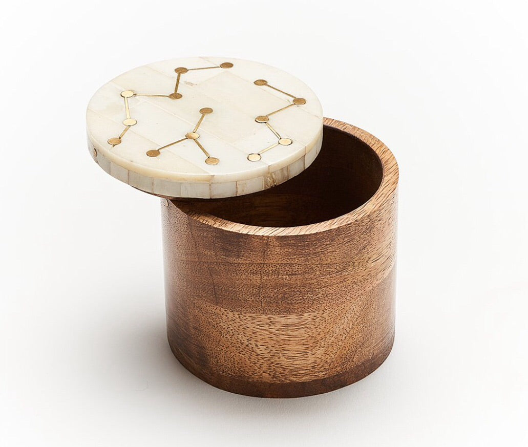 Ethically handcrafted from sustainably harvested mango wood in north central India, our Jyotisha Collection features a beautiful, brass inlaid constellation design. Master artisans in Old Delhi skillfully hand carve wood and bone elements to create unique, eye catching inlay designs. This handcrafted round keepsake box is thoughtfully designed for stylish safekeeping. The handcarved, pearl white bone lid features an intricate, hand inlaid, silver finish brass constellation design. Lid lifts completely to reveal a cylindrical, open interior.