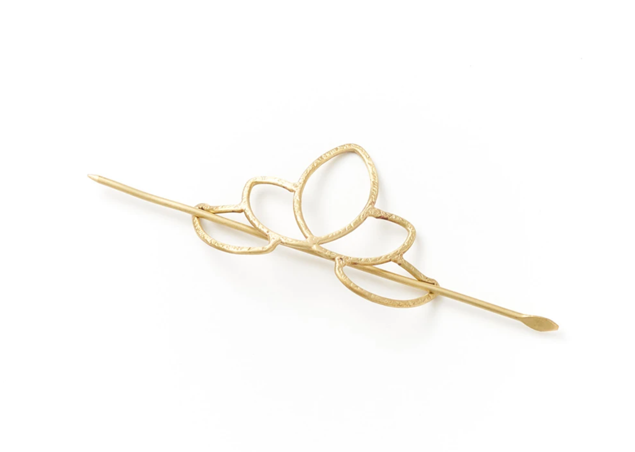 Our Kairavini Collection features unique, lotus-inspired designs in gold and silver finish. This unique, hand hammered hair hoop features a refined lotus shape with matching pin in gold finish brass.