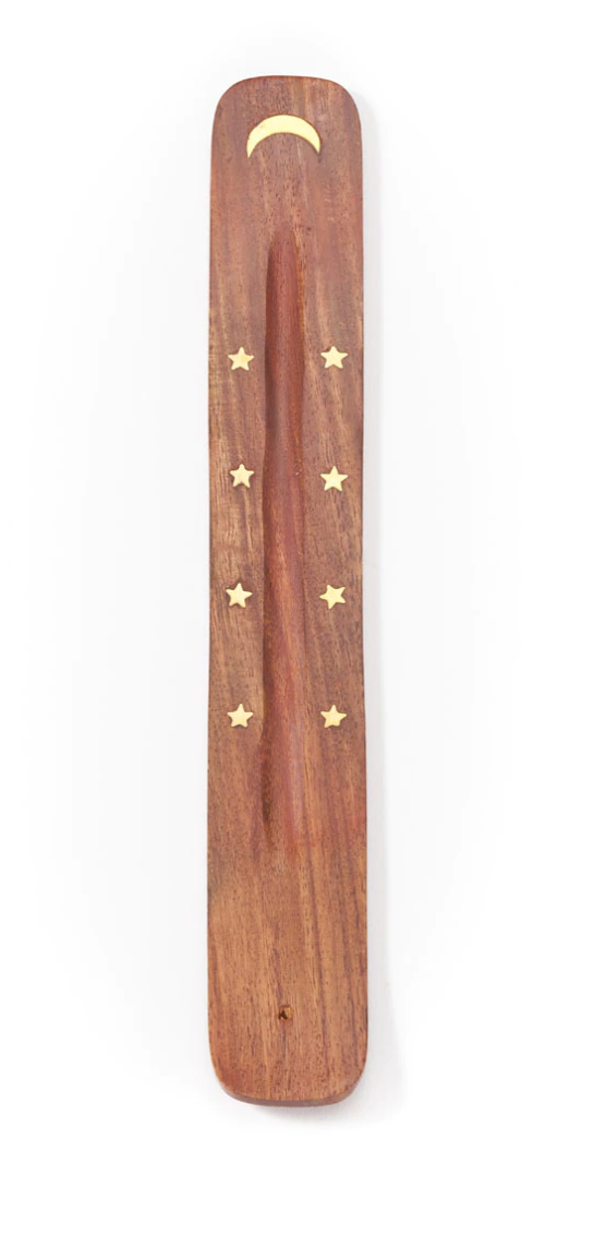 Ethically handcrafted with sustainably harvested mango wood in north central India, our enchanting Nakshatra Collection features beautiful, inlaid crescent moon and star constellation designs. The art of traditional Indian wood craft requires mastery, passed down through generations, to create intricately hand carved treasures from solid blocks of mango wood. This attractive incense holder is expertly hand carved from sustainably harvested mango wood with a hole to support one incense stick. This piece features an alluring, gold finish brass, crescent moon and star lunar inlay design.