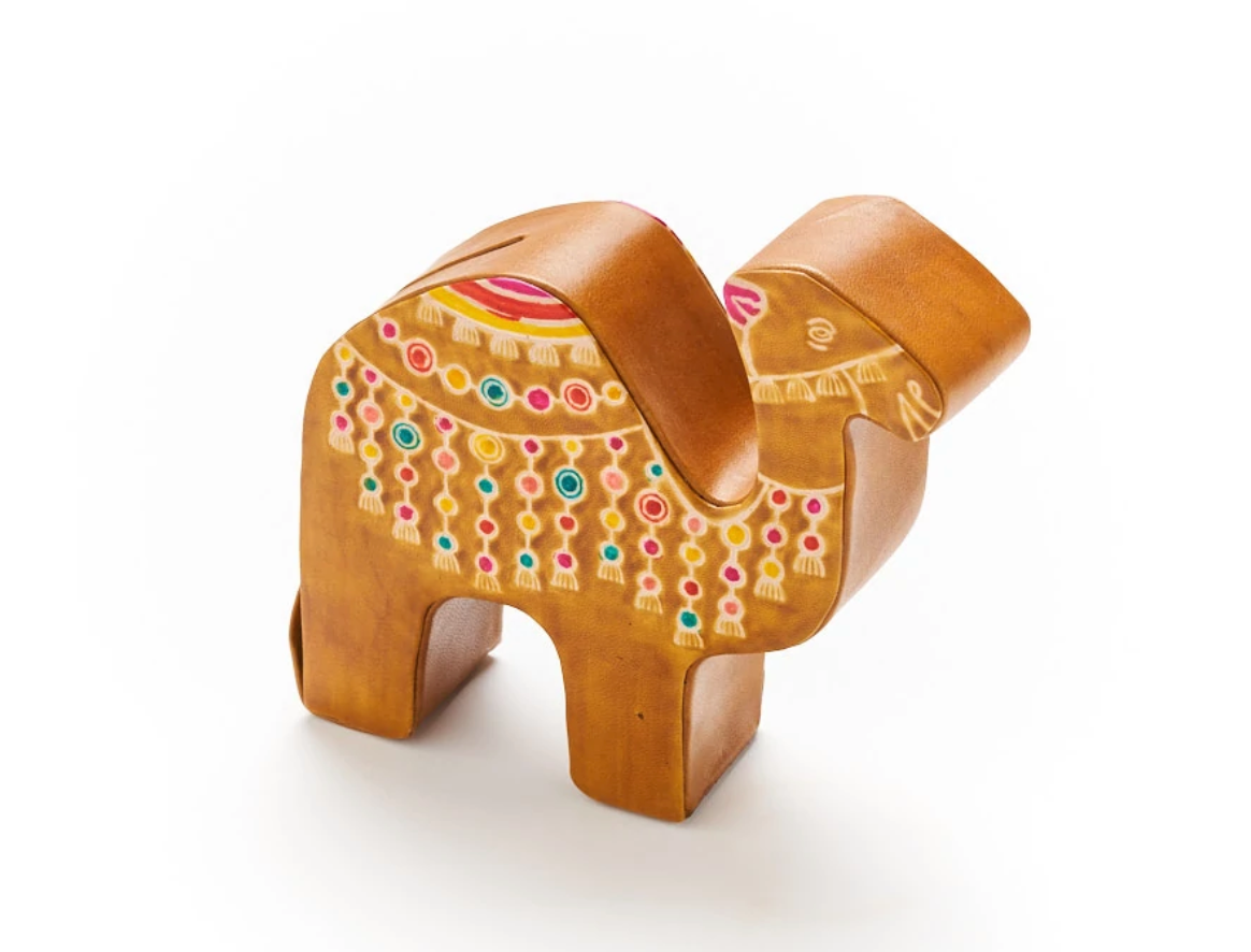 Handcrafted leather bank features a colorful design combining traditional techniques in Indian leather craft, ethically sourced, cruelty-free leather, and eco conscious vegetable tanning. The cultural arts of leather craft and leather...