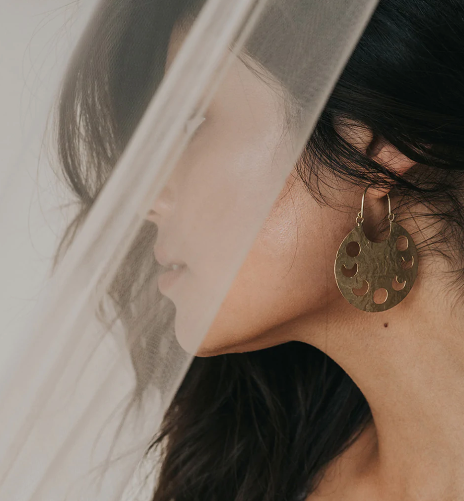 Our alluring Rajani Collection features simple, lunar inspired designs, combining exquisite mother of pearl, gold finish charms, and teal patina accents. Traditional jewelry making techniques of Old Delhi are thoughtfully applied in these refined lunar motifs for a uniquely rich quality. These handcrafted earrings feature hand hammered, gold finish medallion charms with a lunar phase cutout design and clean wire setting.