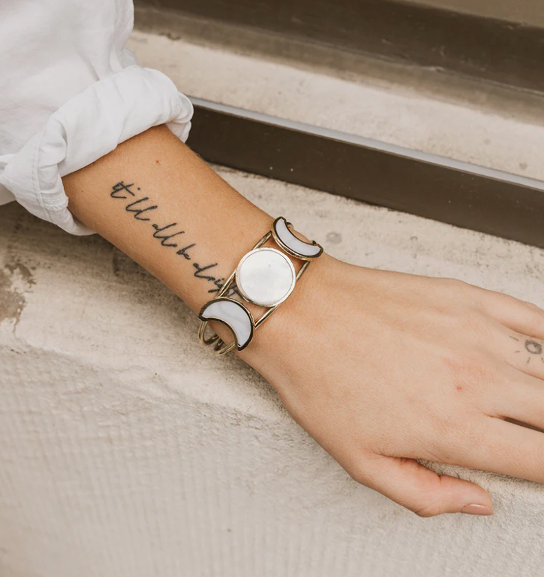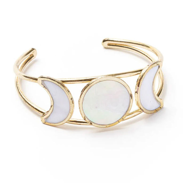 Our alluring Rajani Collection combines exquisite, shimmering mother of pearl shell and clean line, gold finish settings in refined, lunar inspired designs. This lightweight, handcrafted cuff bracelet features eye-catching, mother of pearl crescent and full moon charms in a gold finish setting. Each lunar inspired charm is expertly handcrafted from natural mother of pearl shell. Traditional jewelry making techniques of Old Delhi are thoughtfully applied in these modern designs for a uniquely rich quality.