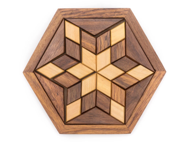 Decorative geometric star puzzle handcrafted from ethically sourced sheesham and haldu woods. DIMENSIONS:6.25" L x 5.25" W x 0.5" H