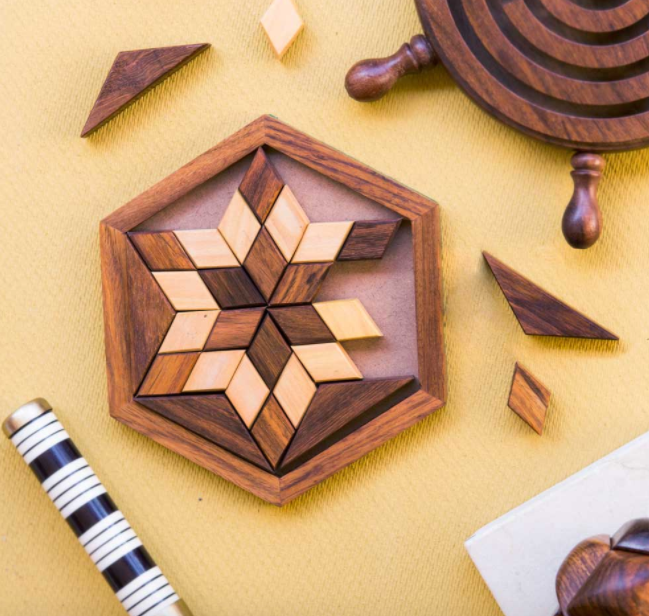Decorative geometric star puzzle handcrafted from ethically sourced sheesham and haldu woods.