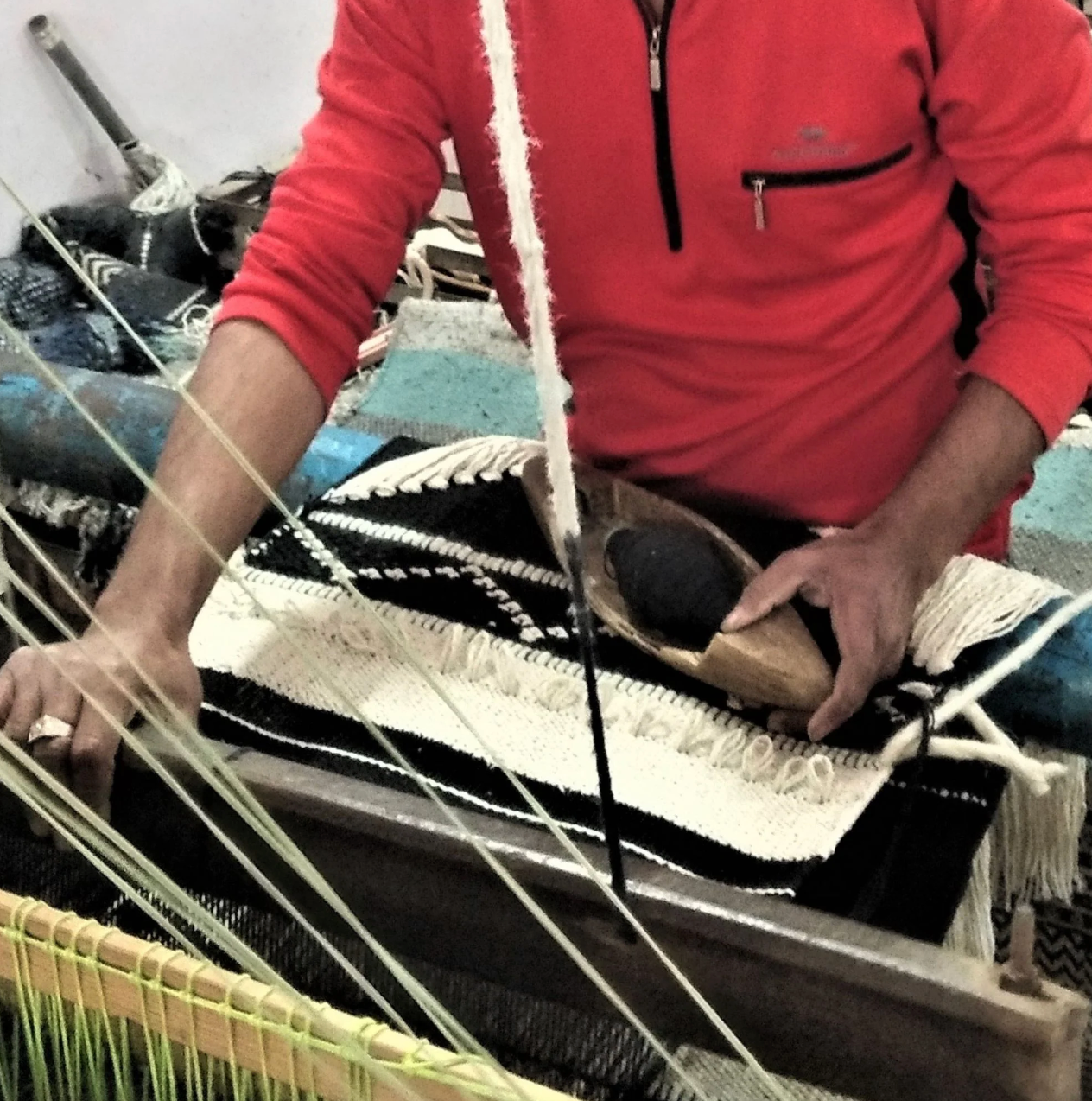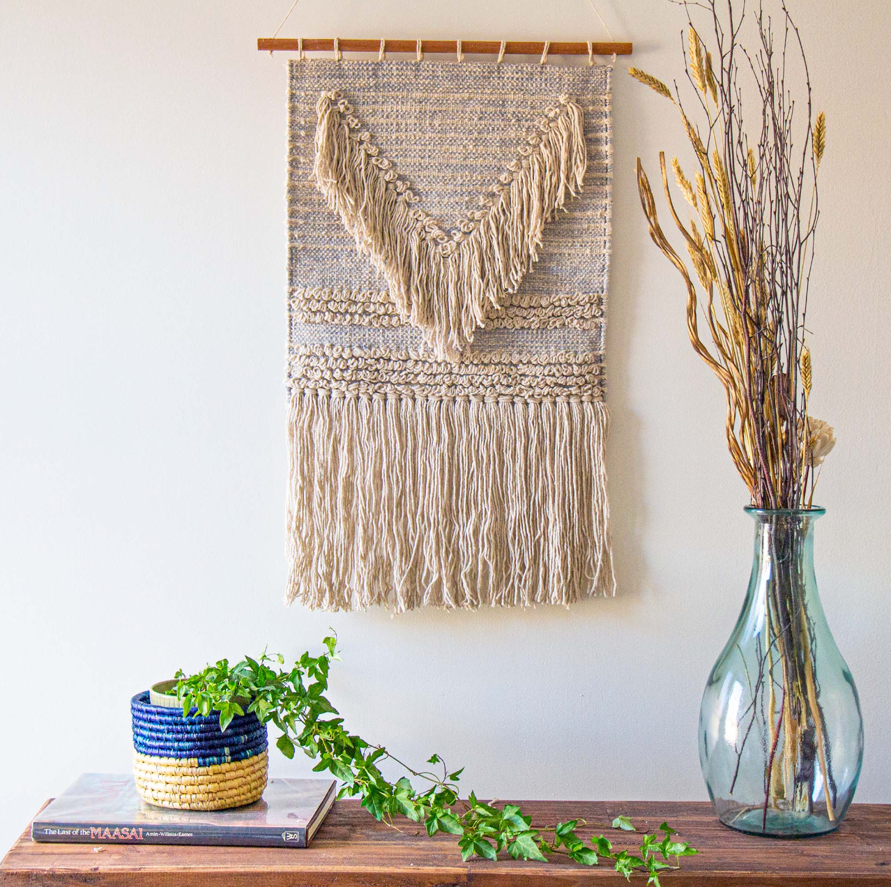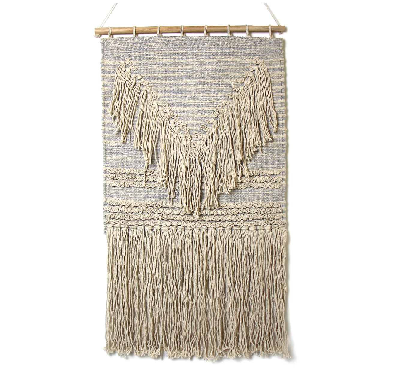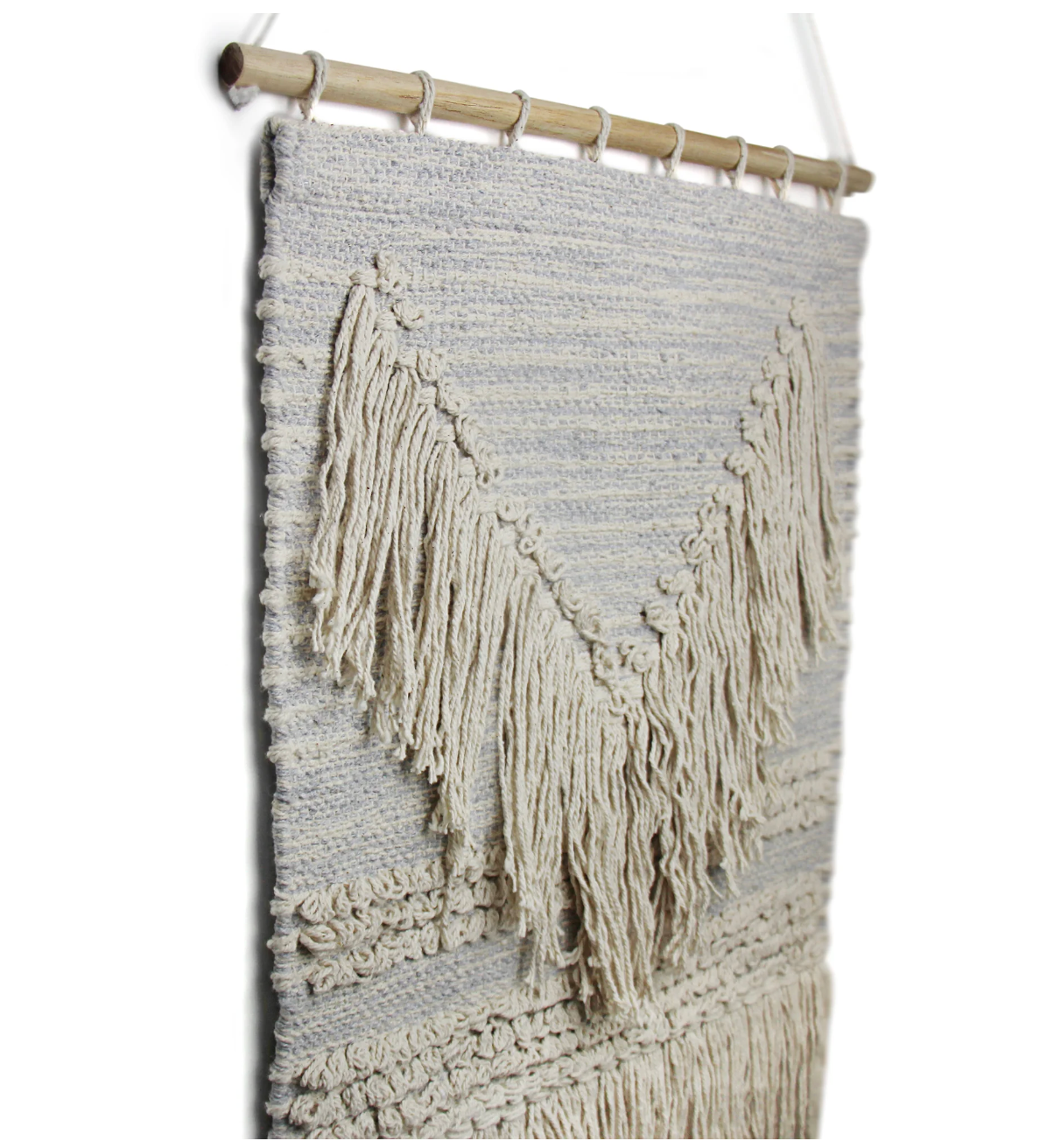 The woven macrame wall art is crafted by hand in a region of India called Panipat, Haryana. Measuring 16 inches by 26 inches, this is versatile Boho piece that can be hung in many spots. The base is a soft combination of woven blue-grey and cream. The fringe and loops throughout create a simple, yet elegant pattern. Cream fringe across the bottom finishes off the artwork. This stands apart even further because it is constructed from recycled cotton yarn that is treated and mill-dyed. Sustainable Decor at its best!