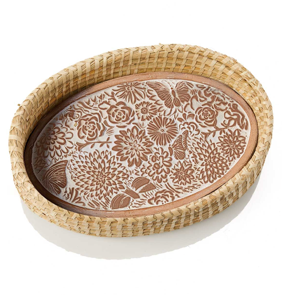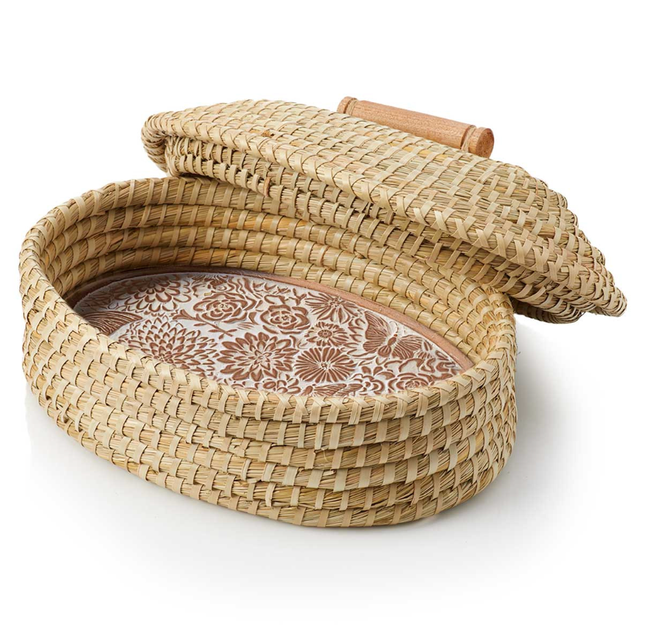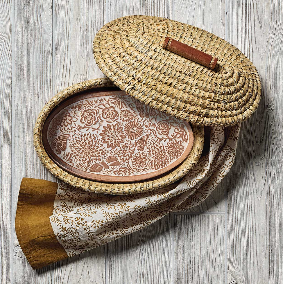 Our Butterfly Garden Breadwarmer combines functional design with exemplary artistry, making it a must-have for any home. This unique piece features a whitewashed terra cotta stone, decorated with a three-dimensional floral design, which rests within a handwoven kaisa grass basket adorned with a palm wrap. Not only is this fair trade warmer oven safe, but it also serves as a popular gift item, ideal for any occasion.