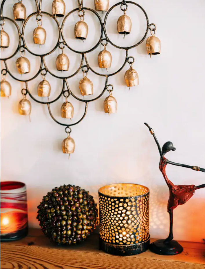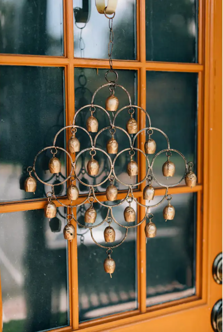 The Chorus of Bells Wind Chime features 23 bells all bringing you unique resonating sounds on the wind. This fair trade wind chime is handcrafted from iron and will obtain a gorgeous patina when left outside to weather. If you love the sheen on the bells, keep it indoors, or under cover to protect from patina.