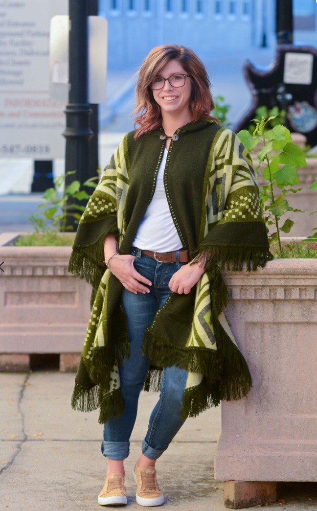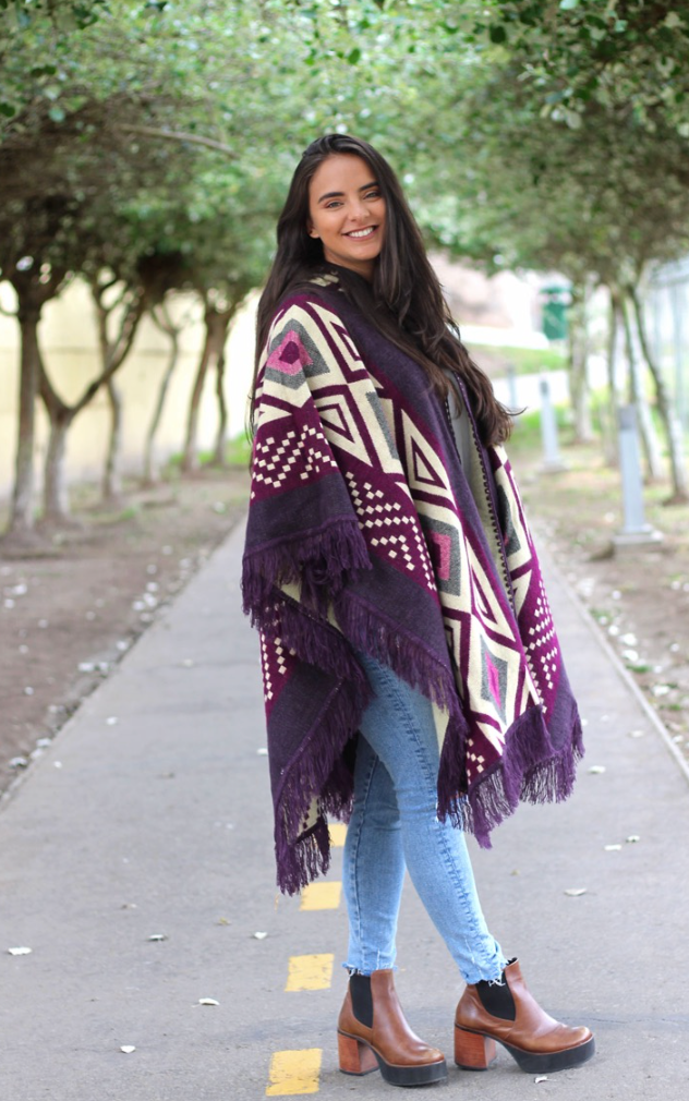 An open-front poncho with single button closure near the neckline. Completely comfortable and stylish with intricate and bold patterns. The look is finished with a roomy hood and fringe edging. Acrylic. One size. 3" fringe. Made in Ecuador.