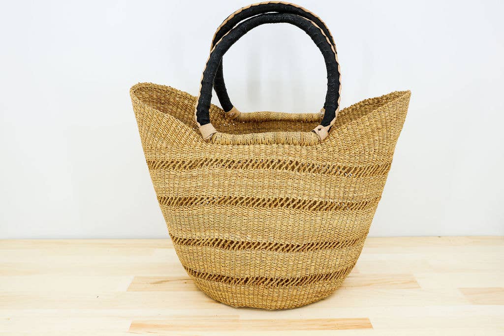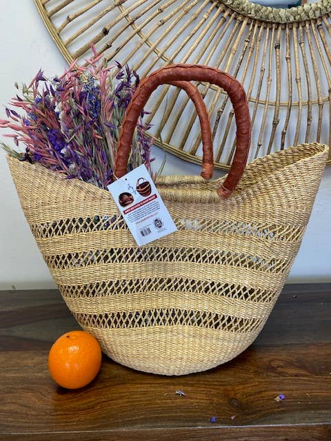 Our dye-free, fair trade U-shopper grocery tote basket is handwoven from Ghanaian dried vetiver grass and comes with a sturdy leather handle in black or brown. Available in two weaves: open or tight. Container or utility baskets like these are durable and can be put to multiple uses, such as: a beach bag, carry-on or weekender, crafting or knitting caddy, farmer's market basket, grocery or shopping bag, hamper or laundry basket, handbag or tote, home decor basket, laptop carrier, picnic basket, pot planter, tabletop centerpiece, or for storage, to name a few! Vetiver grass, also known as elephant grass, aids in soil and water conservation, helping smallholder farmers with environmental rehabilitation efforts, including erosion control, runoff retention and remediation of polluted land and water. Dimensions: Large: depth 11”-13”; diameter 16”-18” Materials: vetiver grass, leather