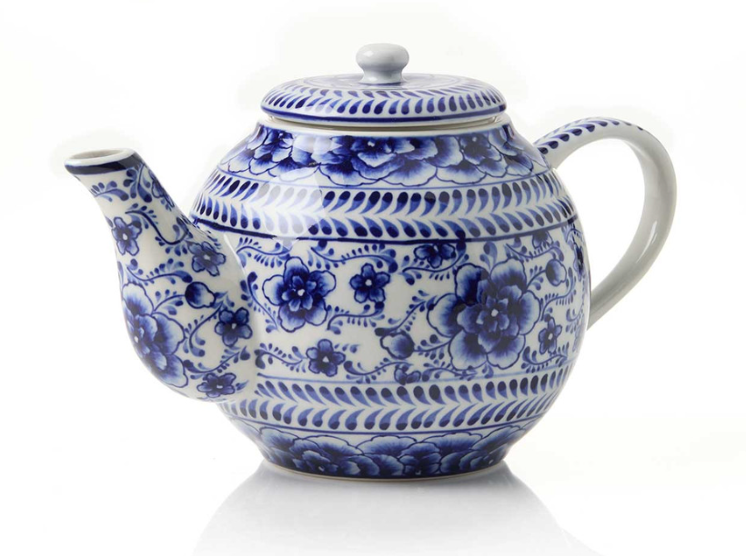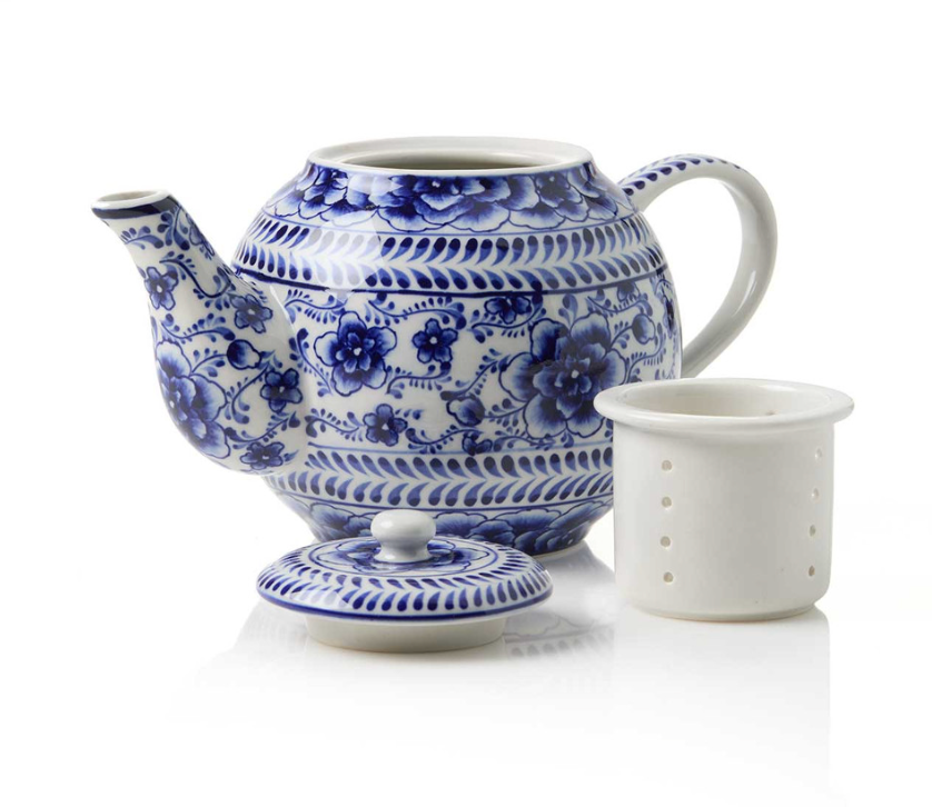 Crafted from natural ceramic in the village of Bat Trang, known for its long tradition of creating fine ceramics, this gorgeous and hand-painted chinoiserie tea infuser pot features indigo floral motifs on a white background. Looks especially beautiful when paired with our other Indigo Blooms ceramic pieces! Microwave and dishwasher safe. 3 pieces. Dimensions: 6"h x 10"w x 6"dia