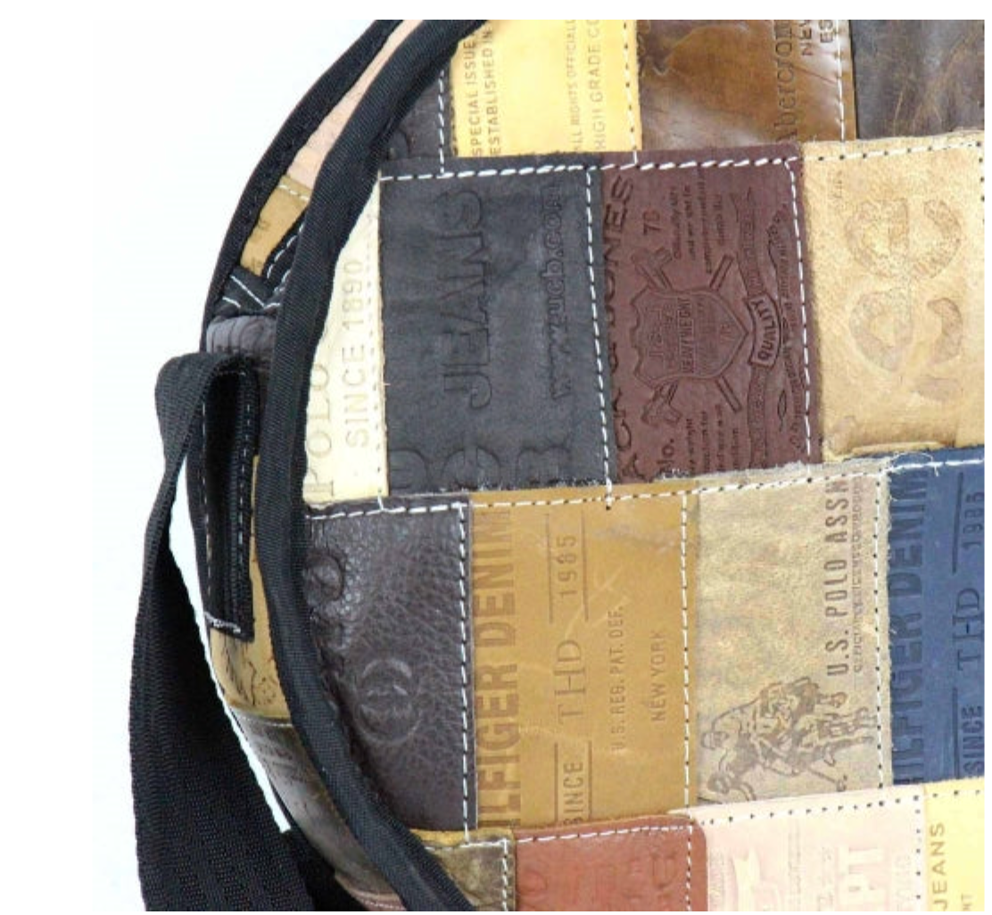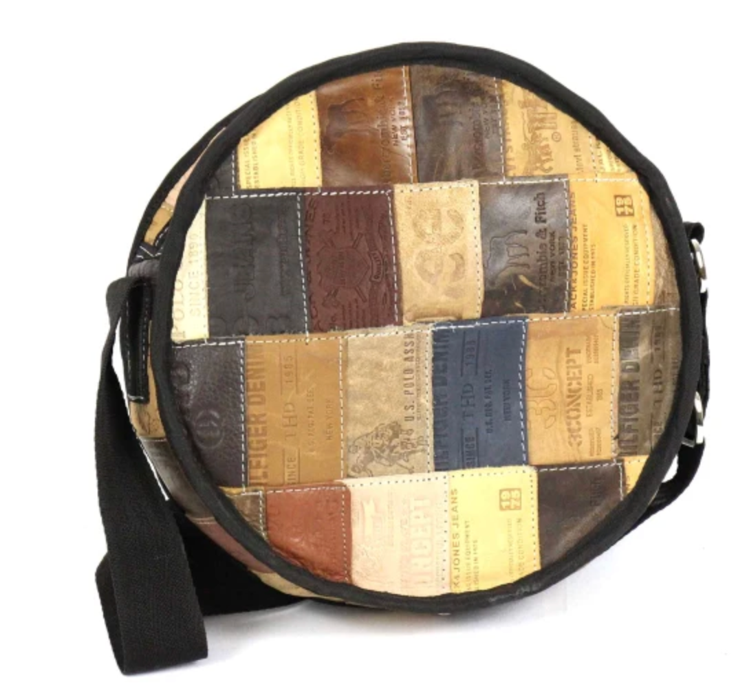 Unique and eye catching! This round bag is crafted from unused leather jean patches, making each bag truly one-of-a-kind. Spacious interior is lined with denim and features a large zippered pocket...