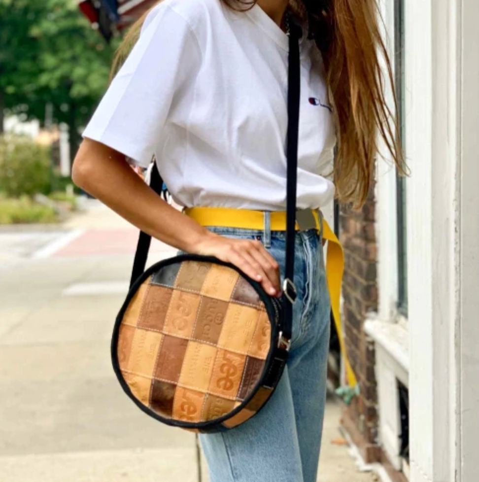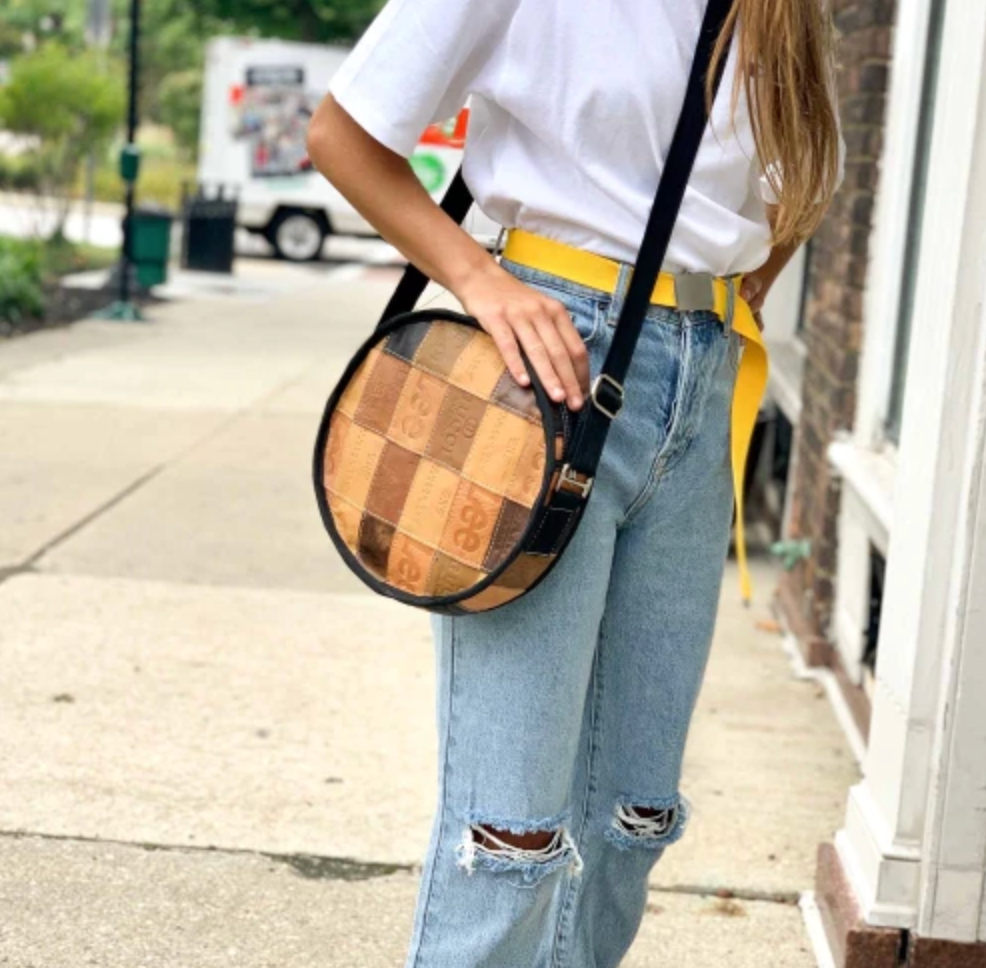 Unique and eye catching! This round bag is crafted from unused leather jean patches, making each bag truly one-of-a-kind. Spacious interior is lined with denim and features a large zippered pocket and a smaller open pocket for your essentials.