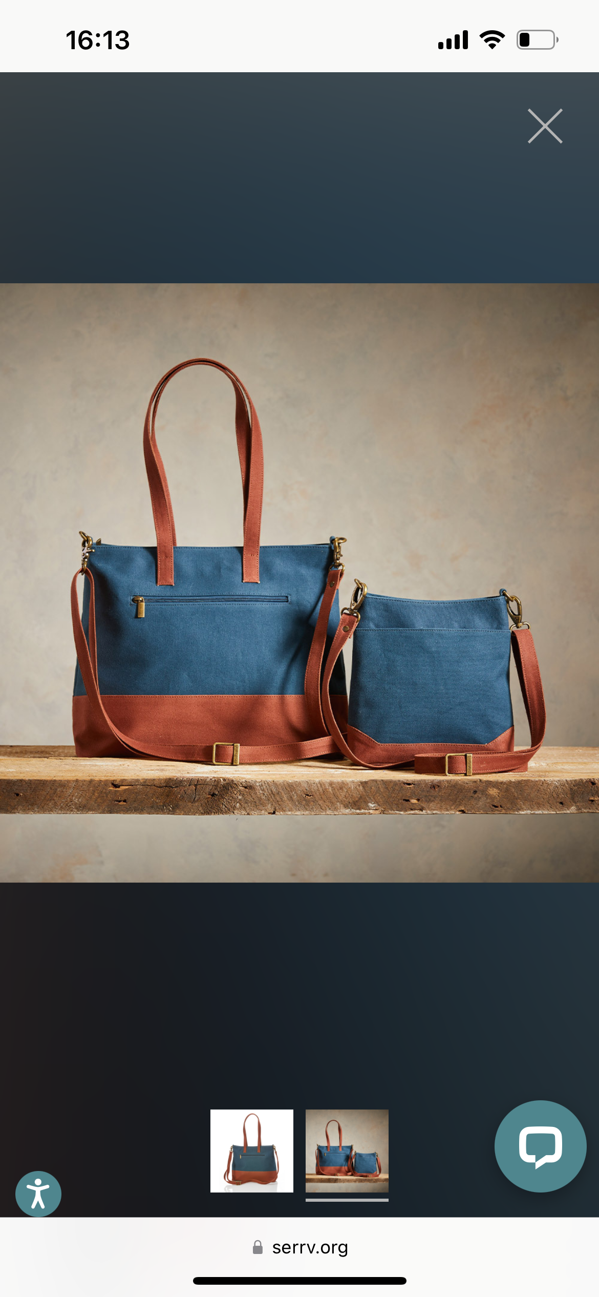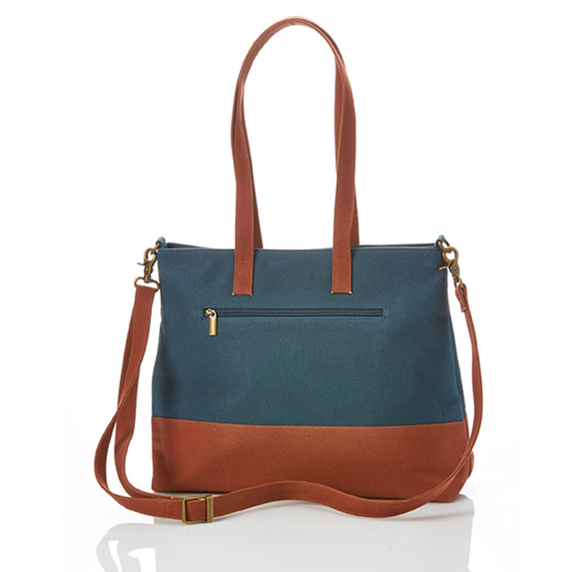 This navy and cinnamon tote is stylish enough to carry with any outfit, and sturdy enough to withstand day-to-day use. Features antique brass hardware and white and olive fabric lining, with interior and exterior zipper pockets, three interior slip pockets, and 29"l shoulder straps. Zip closure. 100% cotton canvas, vegan. Dimensions: 12 3/4"h x 18"w x 5"d.