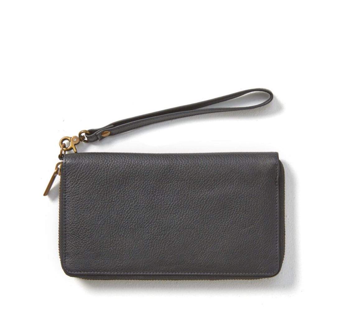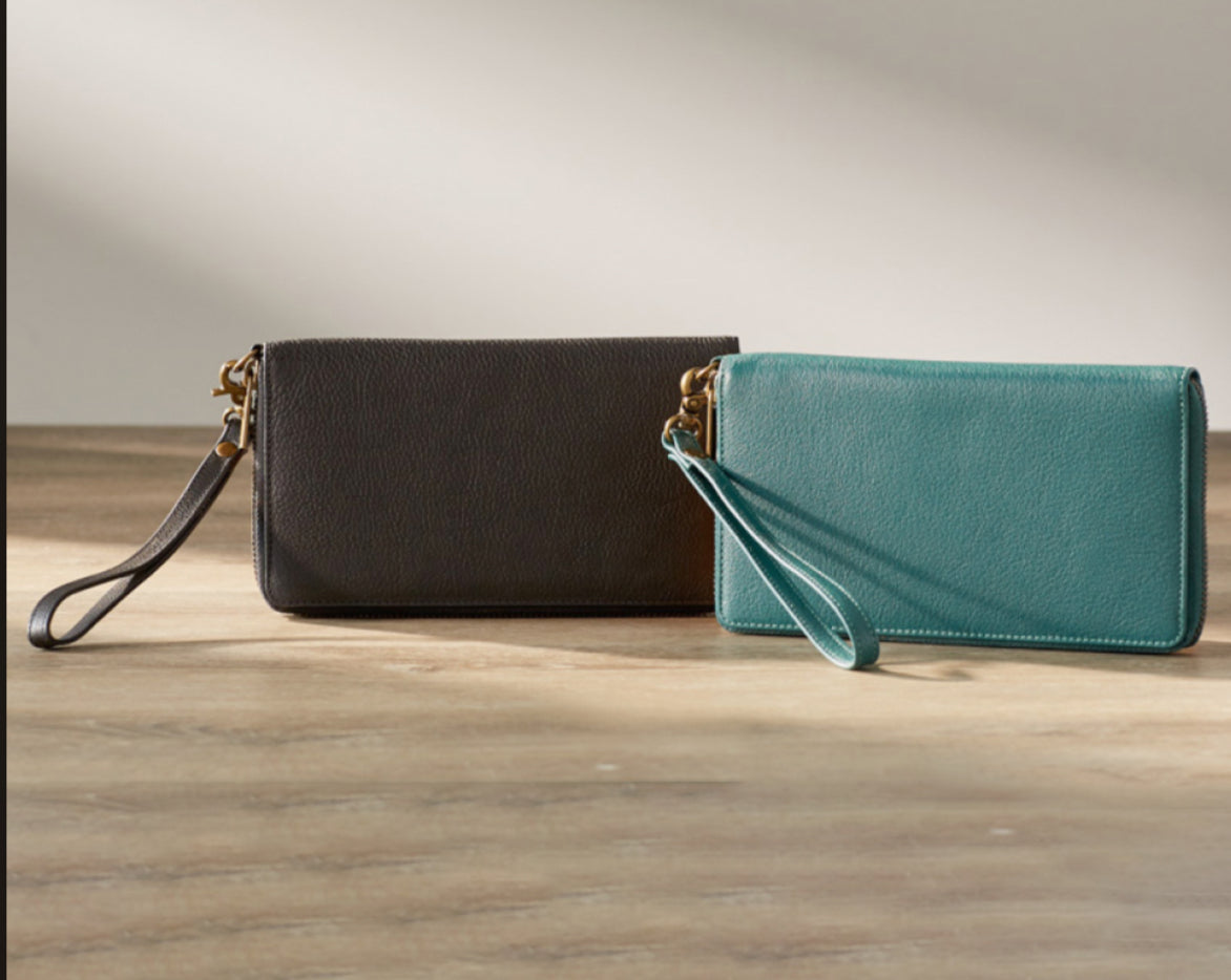 Artisans in India craft this incredibly soft leather wallet. Accordion style with zip closure, two large open pockets, and six card slots. Central zip pocket has additional card slot on one side. Removable wrist strap is 6 3/4"l. Antique brass hardware. 8"l x 4 1/2"h x 3/4"d