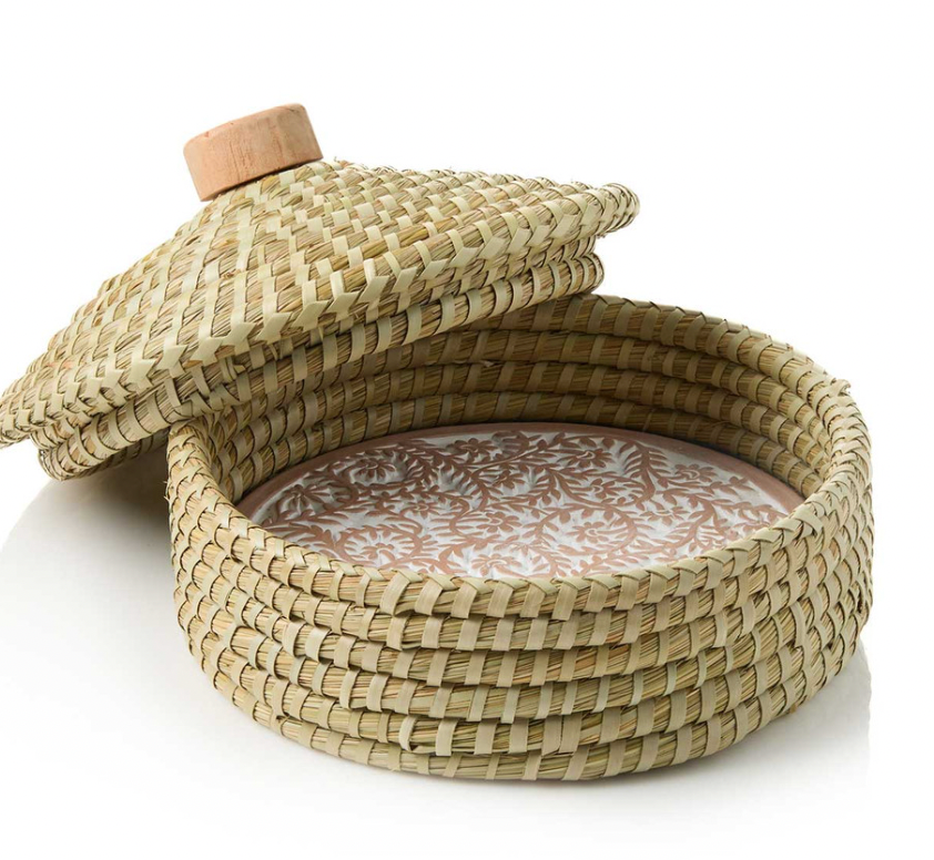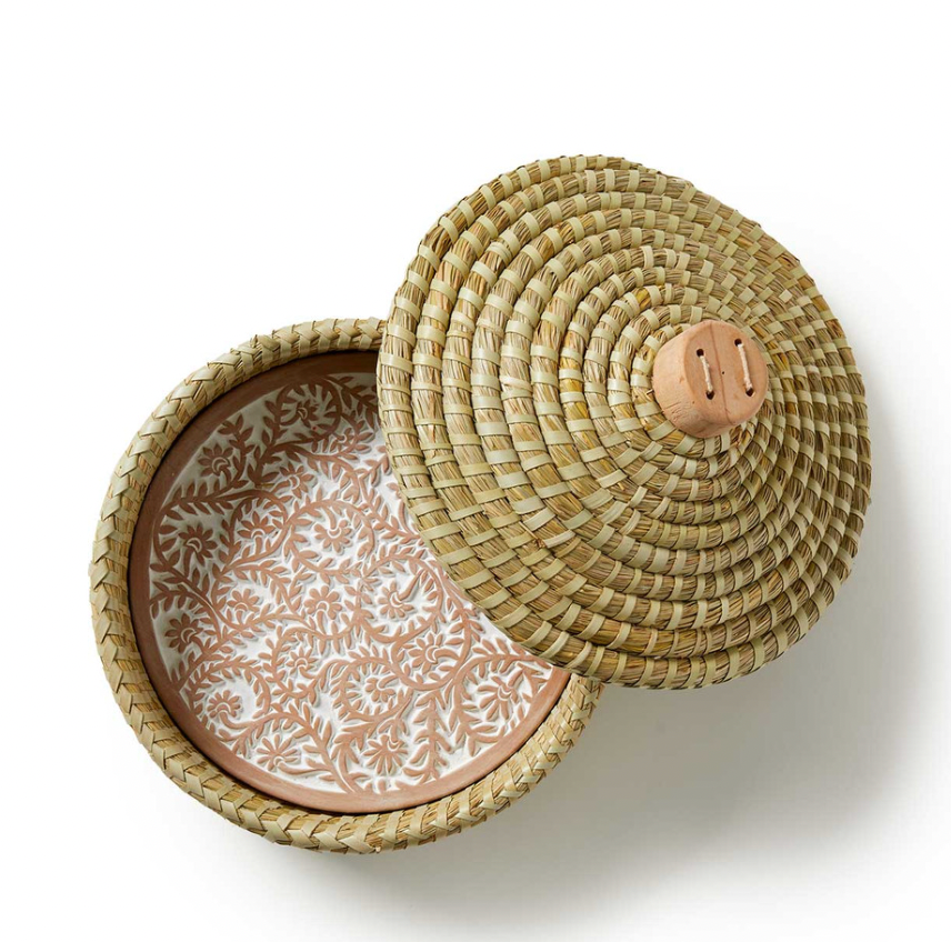 Keep bread, chips, tortillas and more toasty warm in a handmade breadwarmer! This one-of-a-kind terracotta warming stone and bread basket duo features a floral vine motif with a fitted lid to keep your baked goods warm even longer. Each is crafted entirely by hand from natural materials, making this a beautiful and eco-friendly addition to any kitchen. The bread basket is hand woven from sustainable kaisa grass and palm wrap, and comes with a matching woven lid featuring a mahogany wood handle attached by natural jute string. Each terracotta stone is made from natural clay, which is pressed into a specialized mold, baked, then whitewashed for rustic appeal.
