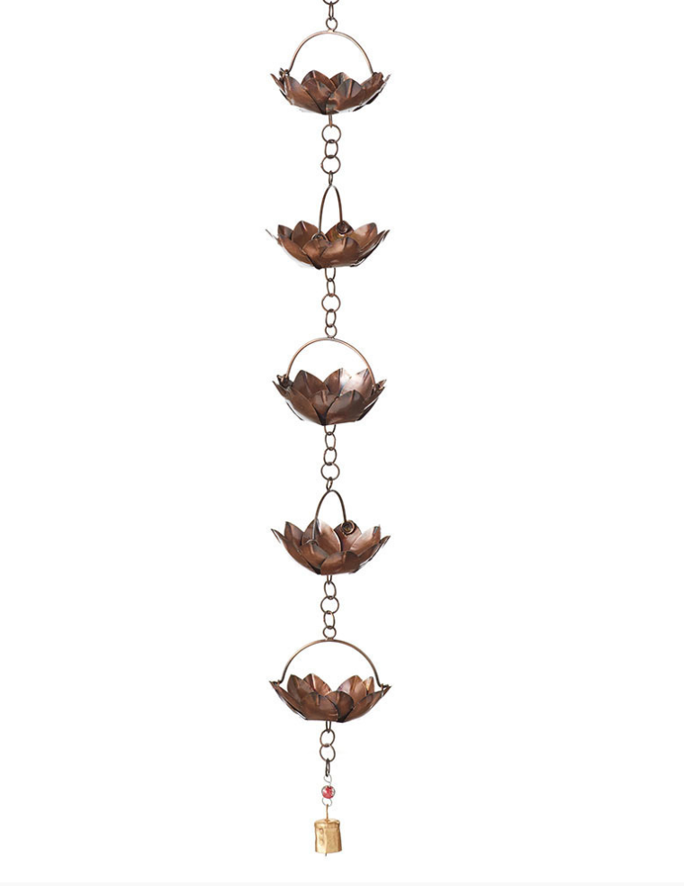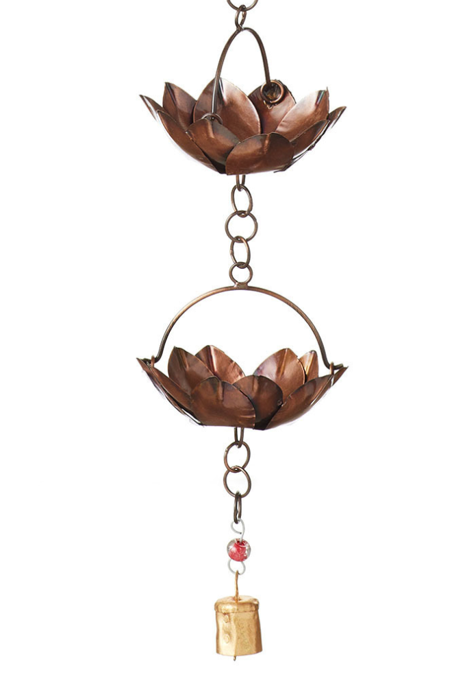 This partially-recycled rain chain is perfect for guiding rain in a beautiful flow to rain barrels, flower beds, and more. Features metal lotuses with a copper finish, plus hanging brass bell...