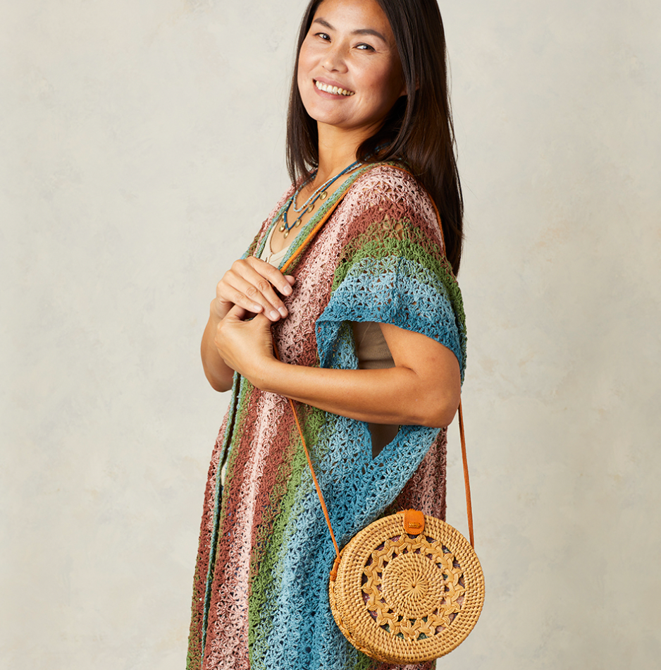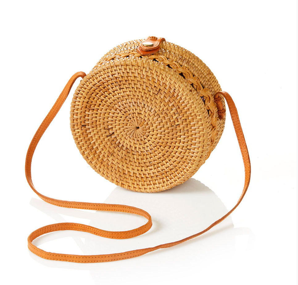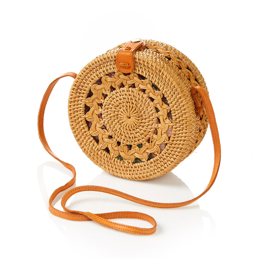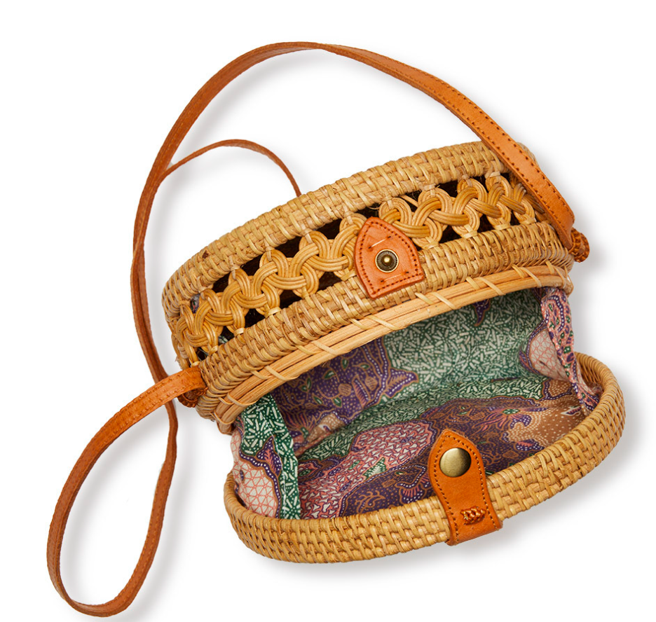 Woven from natural rattan and and grass from local sources, this unique crossbody bag is perfect for a day out. Cotton batik lining, colors and patterns may vary. 48"l leather strap and closure. Antique brass hardware. Dimensions: 8"dia x 3"d