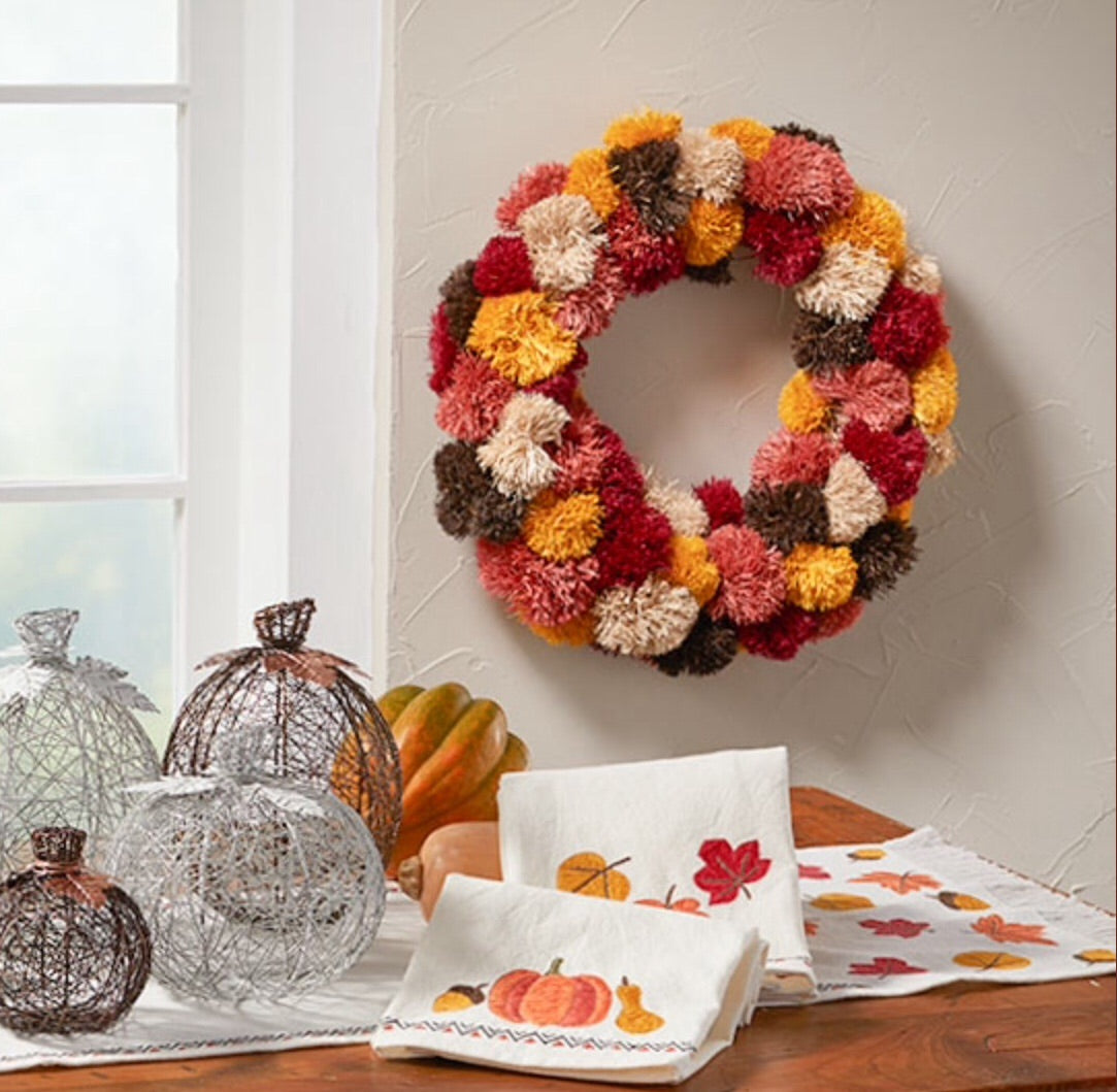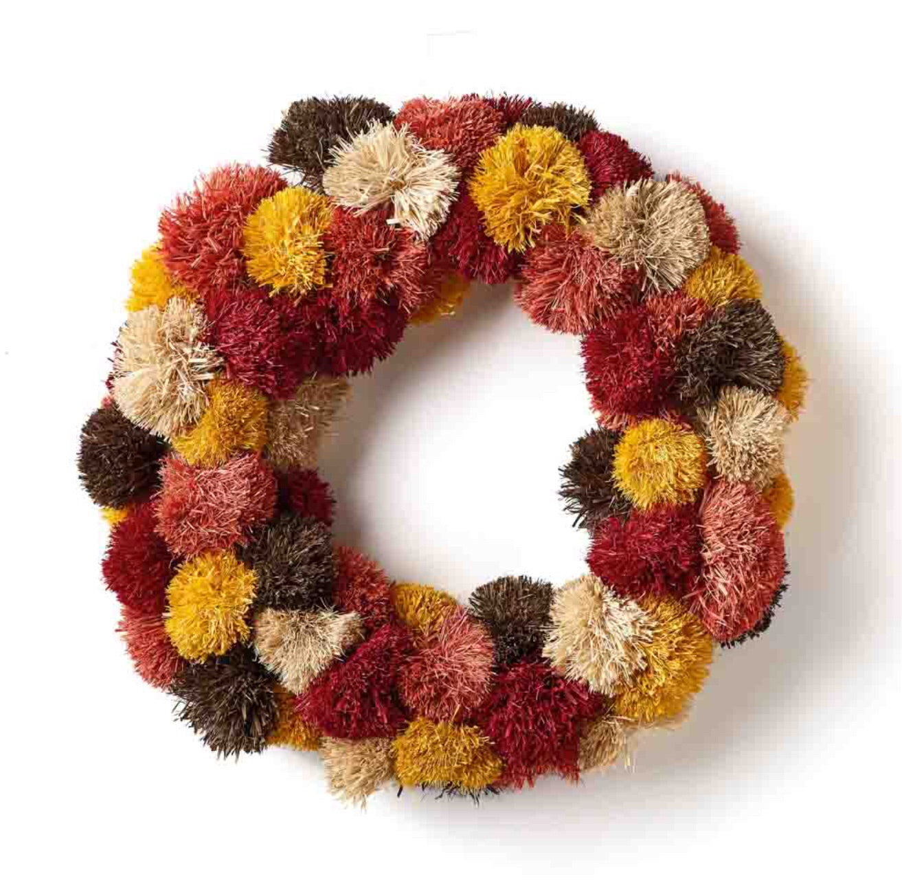 Autumn raffia Pom Pom wreath made in the Philippines. Multi-colored raffia poms decorate a circular base made of raffia wrapped in twine. 19" dia.