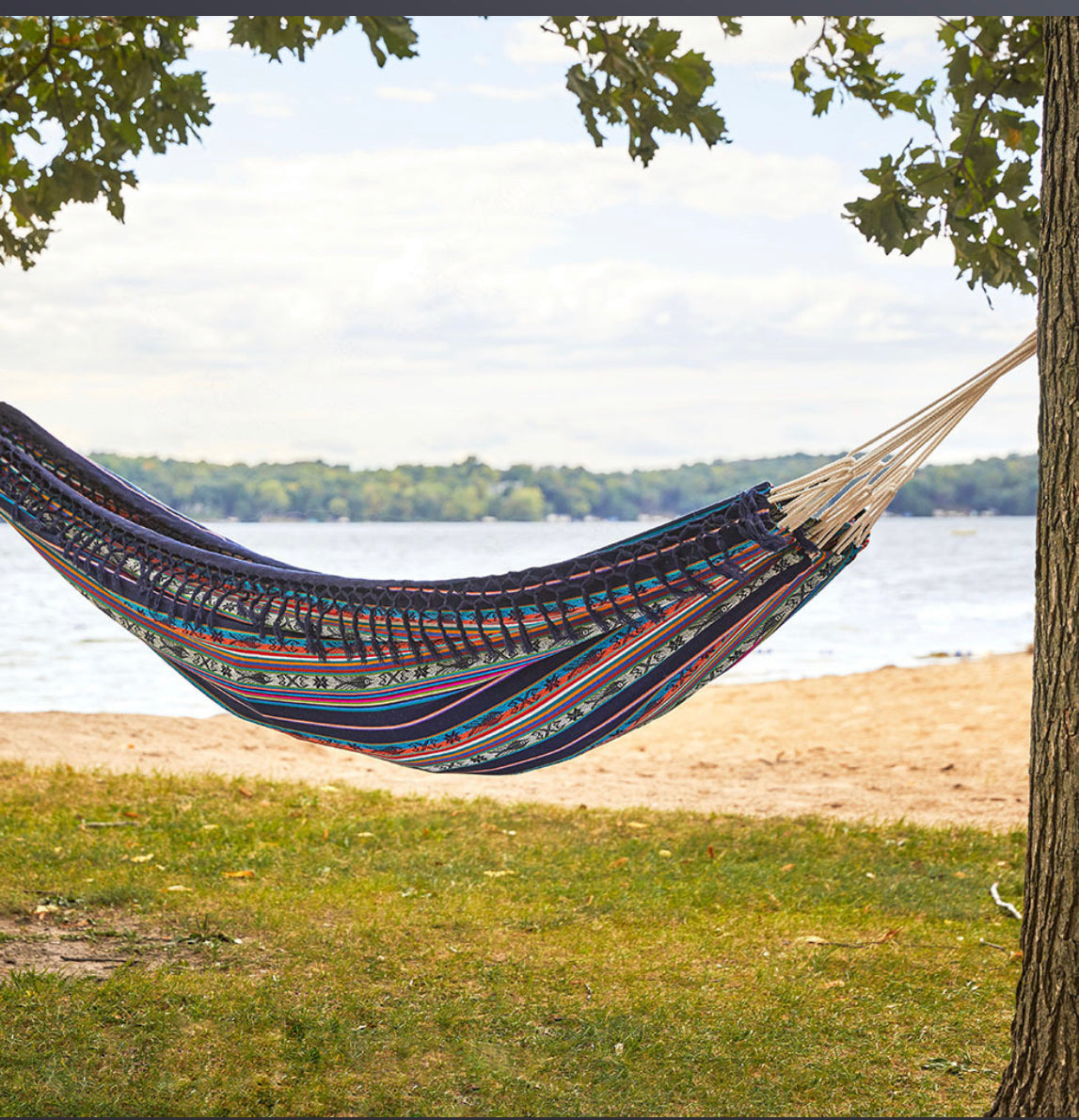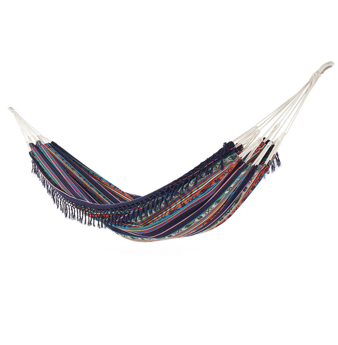 Take a siesta! This handwoven hammock with fringe detail features traditional Ecuadorian patterns and colors, bringing ethnic style to any afternoon nap. Synthetic blend fabric with cotton blend loops. Dimensions: Hammock: 90"l x 50"w; Hanging loops: 3"l