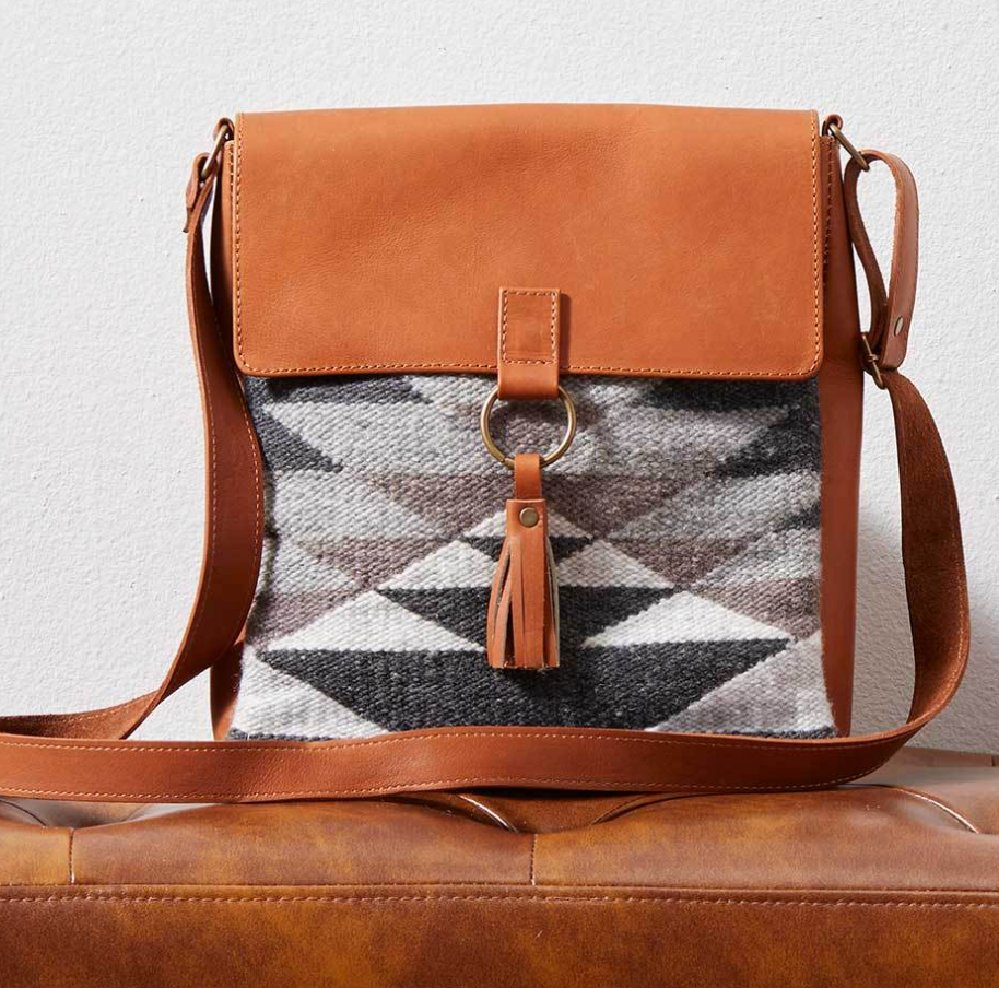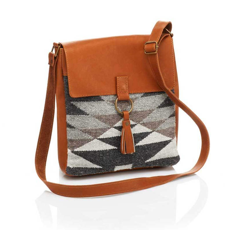Handwoven on a manual loom from cotton and wool, this unique fair trade crossbody bag uses a traditional tapiz-style weave in neutral gray, cream and black, accented by soft, genuine leather. Features silver hardware with magnetic snap closure. Black nylon lining. Single interior 7" x 6" zip pocket and decorative tassel. Adjustable 50"l leather crossbody strap. Pattern may vary, let us choose for you. Spot clean. 11"h x 10"w x 2"d