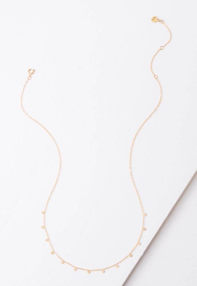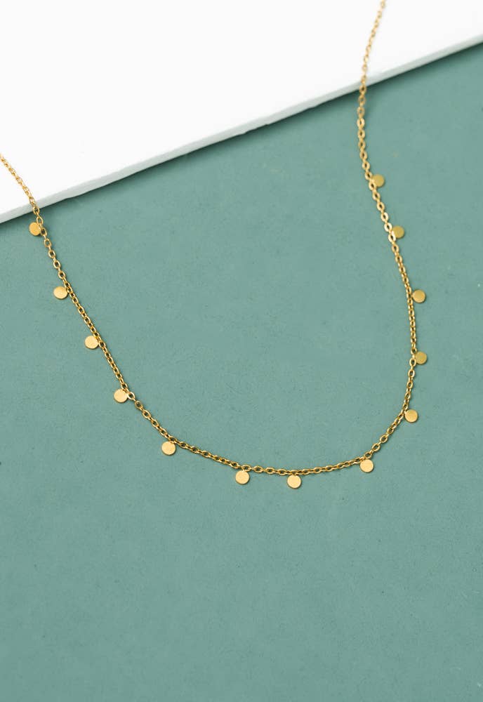 The Evelyn Gold Drop Necklace features features disc pendants that shimmer on an adjustable 14k gold plated stainless steel chain. With the purchase of the Evelyn necklace, more women and girls...