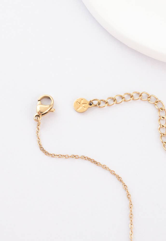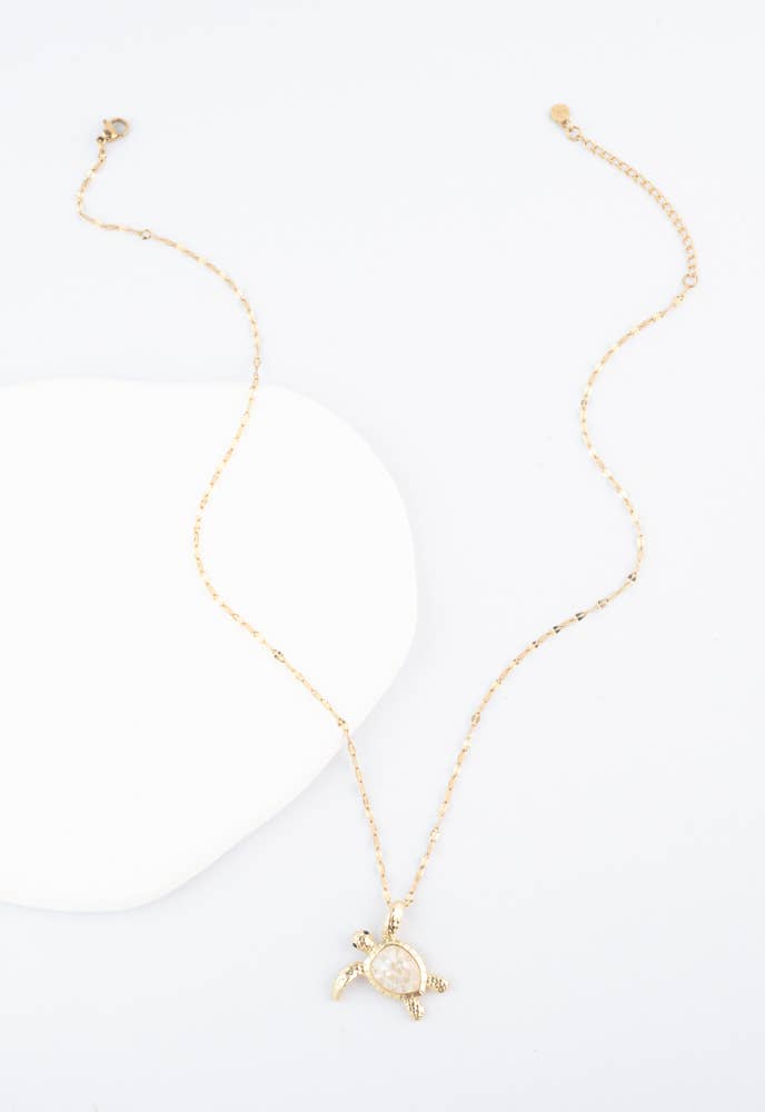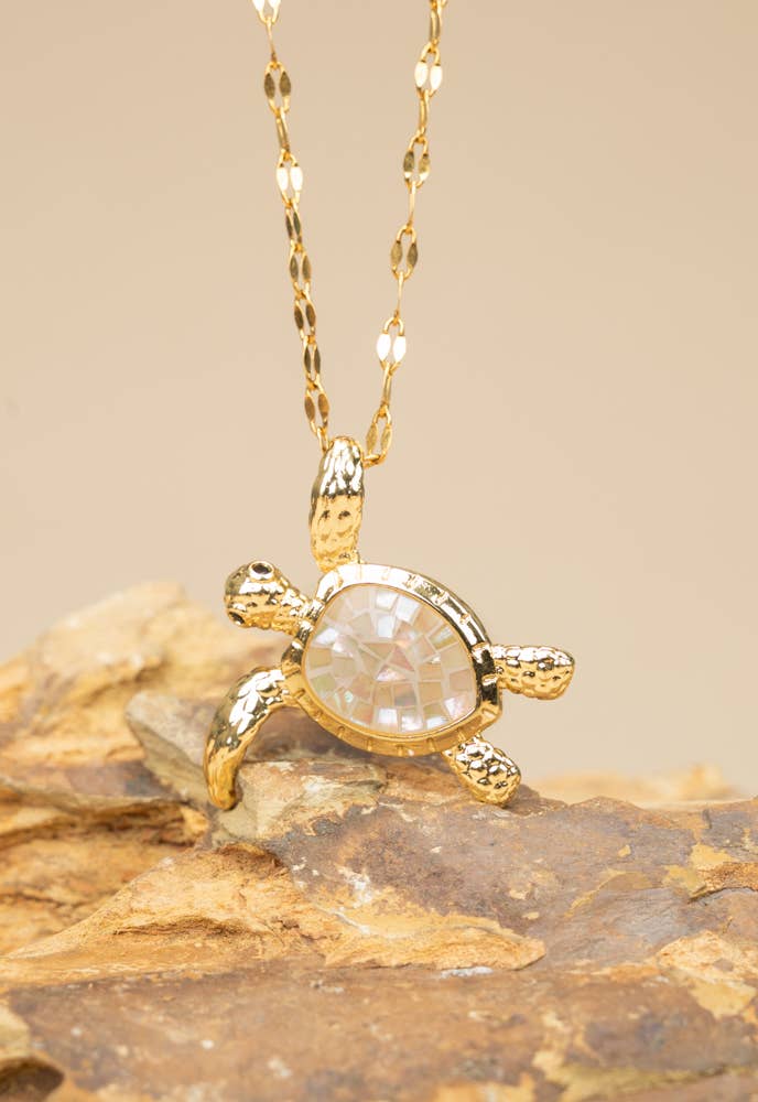 Embrace the wisdom of the ocean with the Turtle Necklace in Mother of Pearl. This beautiful necklace features a 14 K gold plated turtle pendant with a glistening mother-of-pearl shell as its centerpiece. The turtle is a symbol of longevity, protection, and connection to the natural world. The turtle rests on a delicate adjustable gold chain, adding a touch of elegance to any outfit. Crafted with care, each necklace restores hope and provides vocational training to survivors building brighter futures at Starfish Project. The Turtle Necklace in Mother of Pearl is more than an accessory, it's a reminder to carry the wisdom and wonder of the ocean with you wherever you go. Box size and color may vary. Materials: 18k gold Plated stainless steel chain with mother of pearl pendant Hypoallergenic; lead and cadmium free with nickel content less than 100 ppm. Size: 18-20 inches