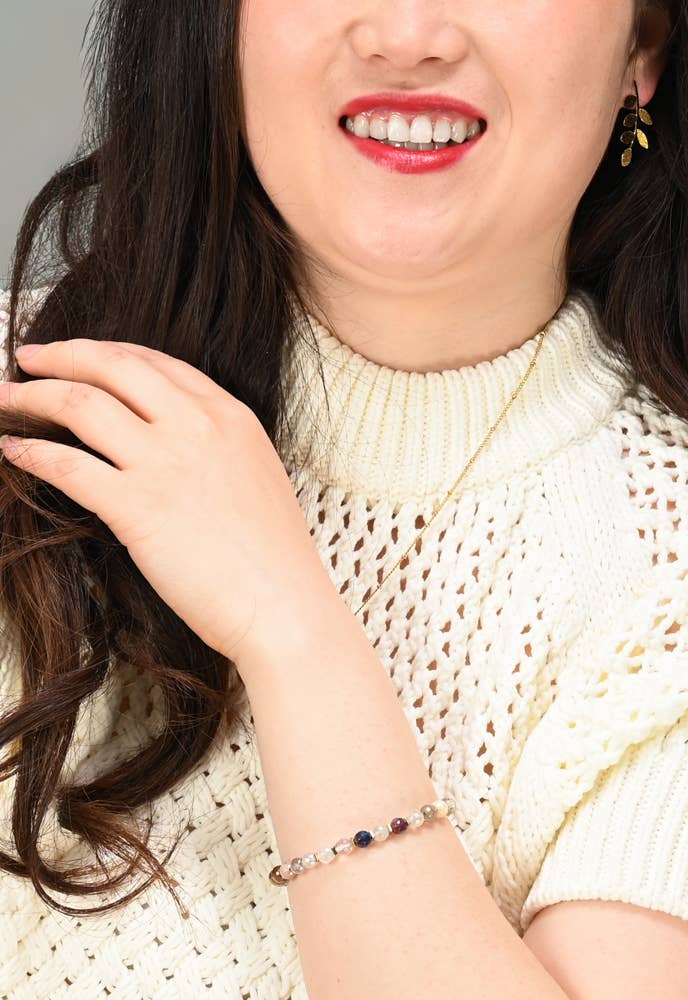Our new dynamic multi-hued beaded bracelet is inspired by YuYu who shares, “I never dared to dream I could learn and so quickly! My team, at Starfish Project, was right. If I can do it, I know you can too! Dare to dream, take your challenge, whatever it might be, and make sure you too, have a strong, loving community of women to support you!.” The light-reflecting beads celebrate the beauty and strength of community as each uniquely colored bead brings out the stunning hues of the next surrounding the shining 14K gold plated accent and starfish charm. Wear and gift this eye-catching neutral YuYu Bracelet to celebrate your community of encouragers and know you are part of YuYu’s. Thank you. Read more of YuYu’s Story. Box size and color may vary. Materials: 14k gold plated satinless steel with hematite and gemstone bracelet Hypoallergenic; lead and cadmium free with nickel content less than 100 ppm. Size: 8.0 inches
