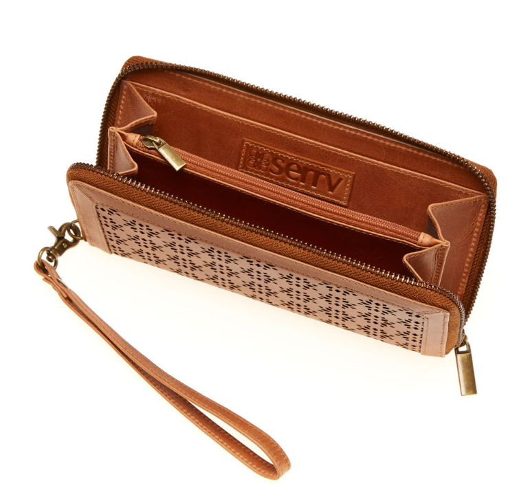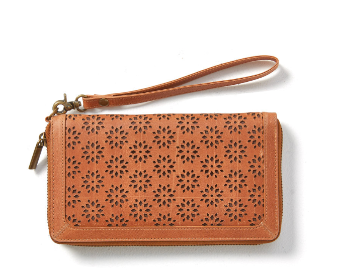 This beautiful handmade accordion-style wallet features cognac brown leather with a hand-cut starburst lace pattern, lined with a deep chocolate twill. Wallet has zip closure and two large open pockets, with one central zip pocket featuring card slot on one side. Six card slots. Removable wrist strap is 6 3/4"l. Wallet: 8"l x 4 1/2"h x 3/4"d
