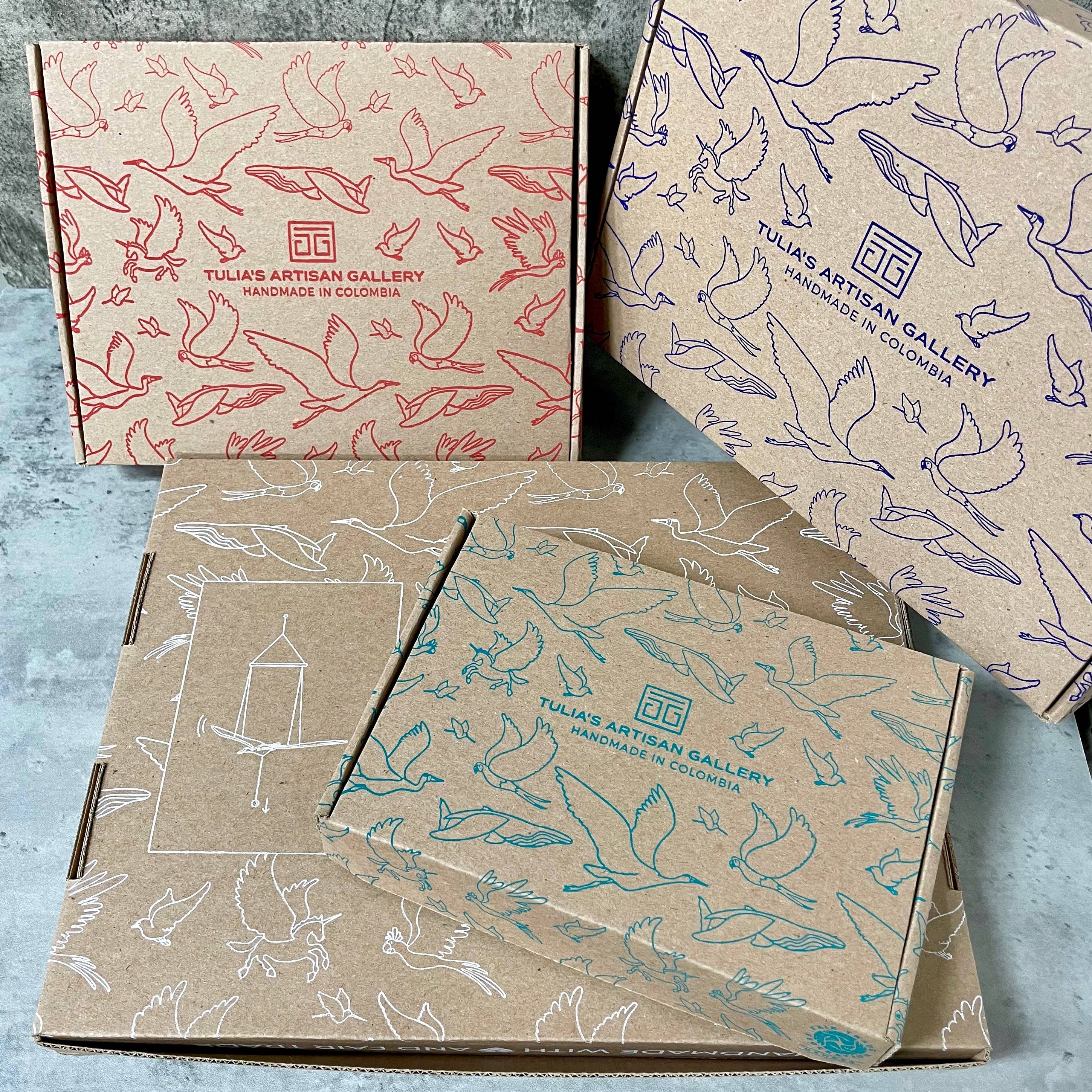 These mobiles are perfectly balanced for the most graceful movement. Pull and release the bottom string and watch them fly. Each is constructed of medium-density fiberboard, hand-painted with non-toxic acrylic paint, and decorated with dyed tagua nuts. Best enjoyed indoors in any room of the house. If hung outside, keep dry. These whimsical flyers are handcrafted by a woman-owned business in Colombia and packaged in custom-printed mailer boxes by another woman-owned business in Chicago. Wingspan: 27in.