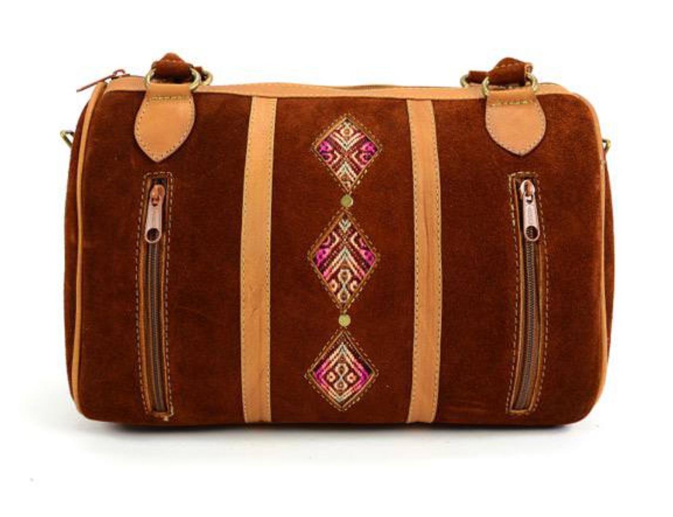 Stunning suede leather bag with smooth leather accents. Two front zipper compartments and one back outer zipper pocket. Long top handles and includes crossbody strap. Bag depth 6.5″ and maximum strap length 51″ long. Comes in a variety of suede colors. Please inquire about current color availability. Made in Ecuador.